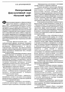 В. В. ДРАНИШНИКОВ Интегративный факультативный курс «Кольский край» ■ I B акультативные предметы и факультативные " курсы были введены в учебный план школ еще в 1966 г постановлением ЦК КПСС и Совета Министров СССР «О мерах дальнейшего улучше ния работы средней образовательной школы» Эта принципиально новая форма обучения и воспитания учащихся позволяла при существовании тогда еди ного в масштабе всей страны учебного плана вно сить элемент вариативности в содержание обучения и создавала условия для большей дифференциации и индивидуализации учебно-воспитательного про цесса, для сотрудничества и творчества учителей и школьников. Сегодня факультативный курс - это необязательный предмет, изучаемый учащимися высших и общеобразовательных учреждений для расш ирения общекультурного и научно- теоретического кругозора. Для факультативных занятий в учебном плане средней и старшей ступени школы выделяются специальные часы, которые ставят в расписание. В группы для изучения факультативных курсов учащихся зачисляют по желанию, из одного или нескольких параллельных курсов, или из разных параллелей (разного возраста). Старшеклассникам разрешается посещать одновременно занятия нескольких факультативных курсов. Учителя могут составлять авторские программы , которые утверждаются педагогическим советом школы. Факультативы условно в соответствии с целями классифицируют следующим образом: - Факультативы по предметам, входящие в учебный план типа «Курс повышения уровня знаний», цель которых - углубленно изучить содержание учебного предмета, систем ати зировать и обобщить полученные на уроке знания. - Прикладные, цель которых - знакомство с важнейшими путями и методами использования знаний изученного предмета на практике и развитие интереса к современной науке. - Специальные (спецкурсы), цель которых - углубленно рассм отреть отдельные вопросы основного курса и проблемы, выходящие за рамки - Межпредметные, цель которых - интеграц знаний учащихся о природе и обществе. Ученые, методисты, учителя сразу обратили внимание на то, что именно изучение (в том или ином аспекте, в соответствии с тематикой ф акультатива) м естного м атериала делает возможным широко организовать самостоятельную работу учащихся. Краеведение представляет собой прекрасную естественную лабораторию, где многие сложные проблемы предстают перед учащимися близко, понятно, образно, помогая понять общее, закономерное через частное, конкретное. В программе интегративного краеведческого факультатива, который проводился в школе № 10 г Мурманска более 12 лет, упор делался на развитие мотивации познавательной деятельности детей, увеличение сферы самостоятельной, поисковой работы, так как самостоятельная работа, творчество формируют самосознание школьников, а значит, создают благоприятные условия для гражданского воспитания детей. Мы стремились к тому, чтобы факультатив не только давал краеведческие знания, но и готовил старшеклассников к поисковой работе в походах- экспедициях (основной форме сбора материала для школьного музея), давал знания о методике сбора и изучения источников и материалов по истории края, об основных понятиях краеведения и готовил к практической работе в школьном музее. Важнейшей задачей факультатива мы считали выработку у ребят умений и н
