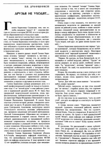 В.В. ДРАНИШНИКОВ ДРУЗЬЯ НЕ УХОДЯТ... Г ■ алина Борисовна Садовская, или, как ее, любя, называли "наша Г. Б." - знаковая фи­ гура не только в истории МГПИ, но и в истории раз­ вития образования всего Кольского края. В нашем институте всегда было много самобыт­ ных, талантливых преподавателей (ученых, методи­ стов), но Галина Борисовна отличалась от всех ярко выраженным педагогическим мастерством, талан­ том побуждать студентов на любые самые скучные, формальные школьные мероприятия, превращая их в творческие дела. Наверное, в памяти разных людей Галина Бори­ совна осталась "разным" человеком и, все-таки, у всех со знаком "плюс", потому что, не смотря на свою эмоциональность, а иногда несдержанность, была человеком искренним, добрым, непримиримым к халтуре, умеющим учитывать возрастные и психо­ логические особенности людей, с которыми обща­ лась. Трения, которые могли возникнуть, быстро уст­ ранялись в деятельности, и часто студенты, наблю­ дая, как они быстро и успешно под руководством преподавателя осваивают практические умения и навыки работы с детьми, становились ее единомыш­ ленниками, а нередко и друзьями на многие годы. Галина Борисовна сыграла решающую роль и в моей профессиональной судьбе не только в студенче­ ские годы. С ее "легкой руки" я стал работать учите­ лем в мурманской средней школе № 10. Здесь был прекрасный педагогический коллектив, очень про­ фессиональная, требовательная администрация в ли­ це директора Марии Федоровны Николаевой и завуча Клавдии Васильевны Буренковой. В школе были опытные учителя истории, разные, совершенно непо­ хожие друг на друга. В среднем звене работала Люд­ мила Григорьевна Анисимова, выпускница нашего Учительского института, ласковая, доброжелатель­ ная, прекрасно владеющая методикой преподавания. Евгений Александрович Абросимов вел историю и обществоведение в старших классах. Внешне спо­ койный, уравновешенный, не придававший особого внимания современным методикам, но прекрасно знавший материал и умевший готовить выпускников к сдаче экзаменов. Школьники любили и того, и дру­ гого учителя, у них было чему поучиться. Все это очень помогло мне со временем стать учителем. Именно Галина Борисовна Садовская убедила Б.А.Голуба, заведующего кафедрой педагогики, в том, что целесообразно этого выпускника МГПИ взять на кафедру ассистентом. К тому времени я уже 12 лет проработал учителем истории, сдал кандидат­ ские экзамены. Но главный "козырь" Галины Бори­ совны состоял в том, что я много лет плодотворно сотрудничаю с институтом: даю открытые уроки, беру студентов на практику, участвую в научно- практических конференциях, проводимых институ­ том на разных кафедрах - педагогики, истории СССР, литературы. Очень скоро я стал понимать, что институт для начинающего ассистента по сравнению со школой далеко не райский уголок, особенно в плане межлич­ ностных отношений между преподавателями на ка­ федре и между кафедрами. Было очень трудно понять, почему специалисты по педагогике и психологии не соблюдают не только общечеловеческую, но и про­ фессиональную этику. Получалось, как у классика: "Суха теория, мой друг, но древо жизни пышно зеле­ неет...". Галина Борисовна преподнесла мне первые "уро­ ки выживания", которые базировались на ее житей­ ской мудрости и многолетнем опыте. Некоторые положения это