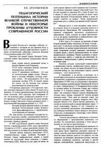 ДУХОВНОСТЬ И ВРЕМЯ В.В. ДРАНИШНИКОВ ПЕДАГОГИЧЕСКИЙ ПОТЕНЦИАЛ ИСТОРИИ ВЕЛИКОЙ ОТЕЧЕСТВЕННОЙ ВОЙНЫ И НЕКОТОРЫЕ ПРОБЛЕМЫ ДУХОВНОСТИ СОВРЕМЕННОЙ РОССИИ D ■ истории России есть знаковые события, от- ношение к которым во все времена было и будет показателем уровня нравственности людей. К таким историческим событиям относится Великая Отечественная война 1941-1945 гг. Значение для нашей страны Великой Отече ственной войны обусловлено следующими обстоя тельствами: - наша страна внесла решающий вклад в разгром фашистской Германии; - СССР понес огромные жертвы (людские, материальные, духовные); - около 27 миллионов погибших - это еще не окончательная цифра потерь. Поиско вики и сегодня собирают останки совет ских солдат... Из призывников 1923 года рождения погибло 97%. В нашей стране нет семьи, где бы близкие или дальние родственники не понесли утрат. "Гитлеровцы разрушили 1710 советских горо дов, поселков городского типа и более 70 тысяч сел и деревень, 32 тысячи промышленных предприятий, 98 тысяч колхозов, 1876 совхозов. Они подорвали 65 тыс. км железных дорог, испортили и вывезли 16 ты сяч паровозов и 428 тысяч вагонов. В целом матери альные потери Советского Союза составили около 2 триллионов 600 миллиардов рублей" [4. С. 552]. - История Второй мировой войны и история Великой Отечественной войны безжало стно фальсифицируются и зарубежными, и российскими историками. На наш взгляд, сегодняшнее государство до пускает серьезную ошибку, недооценивая важность школьного исторического образования в воспитании молодежи. Приведу пример. В 1985 году Юнеско провело опрос большой группы старшеклассников США, ряда европейских государств и СССР с целью выяснения уровня зна ний школьников по истории Второй мировой войны. Лучшие знания показали школьники СССР, социалистических стран, особенно Болгарии и Польши. Самые поверхностные знания, а порой полное их отсутствие, были отмечены у старше классников США. Многие из них даже не знали, на чьей стороне (фашистской Германии или Соединен ных Штатов Америки) воевал Советский Союз. Кто бы мог подумать в середине 80-х годов 20 века, что в начале 21 века ряд юных россиян не будет знать истории Великой Отечественной войны и даже не сможет ответить на вопрос: "Кому принадлежит решающая роль в победе над фашистской Германи- ей?" Меньше всего в этом виноваты сами дети и их учителя. Кому-то в высших эшелонах власти и в Министерстве образования РФ понадобилось так изменить содержание школьного исторического образования, чтобы ученики не знали трагических, но в то же время героических и победоносных стра ниц Великой Отечественной войны. В 80-е годы в 9-х классах на изучение истории Второй мировой войны отводилось 20 часов. Сегодня - всего пять. А еще была система внеклассной и внешко льной работы по военно-патриотическому воспитанию детей, содержание которой знакомило школьников с историей армии и флота преимущественно на основе краеведческого материала Можно вспомнить и массо вую поисковую работу, и шефство над воинскими па мятниками и захоронениями, и работу школьных музе ев боевой славы. Конечно, сегодня существуют гуманитарные и профильные школы, профильные классы, факуль тативы, где можно изучать историю Великой Отече ственной войны, но, как показывают опросы знаний учащихся, - этого недостаточно. К сожалению, и на местах, в регионах, не в 