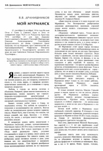 В.В. Дранишников МОЙ МУРМАНСК 125 В.В. ДРАНИШНИКОВ МОЙ МУРМАНСК 21 сентября (4 октября) 1916 года Во имя Отца и Сына и Святаго Духа в Лета от сотворения мира 7424 и от Рождества Христова 1916 сентября 21 дня при Державе Благославейшего Великого Государя Императора Николая Александровича Самодержца Всероссийского во вновь стояшемся граде Романов, что на Мурмане, при Святетельстве же Преосвяшеннейшего Нафанаила Епископа Архангельского и Холмогорского заложен сей храм во имя Святителя Николая Мирликийского Чудотворца... Текст, выгравированный на металлической пластине, которая была заложена в специальное углубление на месте, где планировалось возвести собор в честь нового города - «светильника веры и благодати» Я думаю, у каждого жителя нашего города есть свой, неповторимый, Мурманск. Это зависит от многих обстоятельств: от того, где человек родился, рос, его возраста, социального опыта и, что очень важно, от иерархии духовно нравственных ценностей, да и отношение к городу меняется с возрастом. Любовь к городу не всегда логична и объяснима. Наверное, среди многих компонентов, ее формирующих, можно выделить три главных: природно-географический, архитектурный и человеческий (социально-биографический, связанный с ментальностью горожан). Бывает, человек любит город и Север, не задумываясь почему. Эта любовь не нуждается в пояснении и воспринимается как данность. Иногда любят на эмоциональном уровне вопреки здравому смыслу. Может быть, еще и потому, что «землю, где воздух сладкий, как морс, бросишь - и мчишь, колеся. Но землю, с которою вместе мерз - вовек разлюбить нельзя». В литературе можно найти впечатления о Мурманске писателей, ученых, путешественников, посетивших город в 20-30-е годы, и впечатления эти самые негативные. Вот только некоторые из них: «Подо мной раскинулся город, уступами спускающийся к морю и к заливу; много домов, все они новые, построенные без всякого плана; они разбросаны среди песчаных холмов и дюн; улиц никаких нет, что свидетельствует о внезапном возникновении города... Еще труднее разобраться среди железнодорожных вагонов; их тут несколько сотен, и все они обитаемы - целый поселок. Промежутки между ними заполнены навозом, закутами для свиней, курятниками» (датский писатель М. Андерсен Нексе). «Даже понятие селение и то мало подходит для Мурманска. Это беспорядочно разбросанные скопления разношерстных маленьких строений скорее можно назвать становищем» (океанолог В.А.Васнецов). «Мурманск - забавный город... Только две его достопримечательности привлекают внимание: базар, где под маленькими навесами торгуют почти сплошь китайцы, и ресторан, где вечером пьют пиво матросы и где слышится речь, а к концу вечера и ругань на всех языках» (геолог С.О.Обручев). «В Мурманске стоят среди города песчаные бугры - мертвая, какая-то необыкновенная земля, не подходящая ни для города, ни для сада. Просторные большие дома только начинают строиться. Люди живут в маленьких, кое-как прислоненных к земле бараках. Бараки эти, похоже, из фанеры, и ни на один дом не похожи. И город напоминает стаю сошедших в рейд кораблей. И кажется, что мурманское население - это просто группа бродячих артистов, остановившихся в своих фургонах. Улиц в Мурманске почти нет, а если поглядеть на город - думаешь, что он вовсе и не желает улиц, а согласен жить в хаосе земли» (пи