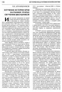 138 ИСТОРИЯ ПЕДАГОГИКИ и психологии В.В. ДРАНИШНИКОВ ИЗУЧЕНИЕ ИСТОРИИ КРАЯ НА РАННИХ ЭТАПАХ ОБУЧЕНИЯ ШКОЛЬНИКОВ И дея изучения краеведения на ранней ступени обучения истории была науч­ но обоснована во второй половине XIX в. выдающимися представителями отечествен­ ной педагогики. Еще в 1867 году в статье «Сделать русские школы русскими» К.Д. Ушинский писал о первейшей необходимости и большой педагогиче­ ской целесообразности обогащения учащихся начи­ ная с начальных классов краеведческими или, как тогда их называли, родиноведческими сведениями. Эти идеи нашли дальнейшее развитие в трудах уче­ ных и деятельности учителей-практиков в начале XX в. В 1902 году московский педагог Н. Родзевич в журнале «Вестник воспитания» в статье «О препо­ давании истории в 1 и 2 классах» развивает мысль о том, что местная история должна послужить «ис­ ходной точкой в преподавании истории». Таким образом, учителя, методисты, ученые в дореволюционной России не только научно обосно­ вали возможность и целесообразность изучения краеведения на ранних ступенях обучения истории, но и разработали содержание и формы внеклассной краеведческой работы по предмету. В советское время идея раннего обучения ис­ тории родного края особенно плодотворно развива­ лась до 1928 г.: существовали многочисленные краеведческие издания, выпускались краеведческие учебники и пособия. С.О. Шмидт называл эти годы «золотым десятилетием краеведения», так как «только с 1917 по 1927 год число краеведческих уч­ реждений и организаций возросло более чем в 10 раз: по неполным данным, со 155 до 1761, причем многие из них выпускали свои издания (иногда - рукописные журналы). Деятельность таких органи­ заций, особенно при отсутствии других научных уч­ реждений, превращала их в, как тогда выражались, своеобразные академии наук на местах» [16. С. 14]. Ведущая роль в организации этой деятельно­ сти принадлежала музейным работникам и учителям школ. «Краеведческий бум» отмечался и на Край­ нем Севере. 17 октября 1926 года образовалось Об­ щество по изучению Мурманского края. На его пер­ вом собрании присутствовало 45 человек, в прези­ диум собрания были избраны Клюге, Алымов и Осиновский. В 1929 году были созданы отделения Общества в самых отдаленных уголках Кольского Заполярья: в Кузомени, Поное, Умбе, Оленице, Кашкаранцах, Варзуге, Тетрино, Пялице. Для вновь созданных отделений решено было выписать на 1919 г. два журнала - «Известия ЦБК» и «Охрана природы». Общеизвестные трагические события 30-х го­ дов нанесли удар по всей духовной жизни общества, в том числе и по организации обучения истории края в начальной школе. Однако на всех этапах сложного социально-экономического и политиче­ ского развития нашей страны ученые, методисты и учителя постоянно высказывали мысль о том, что необходимо в раннем возрасте знакомить детей с историей Отечества, особенно с историей своей «малой родины» - родного края. В некоторых республиках СССР, прежде всего в прибалтийских, уже в 60-е годы ввели краеведче­ ские курсы в начальной школе. Это было важным средством борьбы за сохранение национальной культуры. В РСФСР школьное краеведение ограничива­ лось лишь специальными краеведческими уроками, которые в ряде школ не проводились вообще либо проводились на низком научно-методическом уров­ не, так как далеко не для каждого региона 