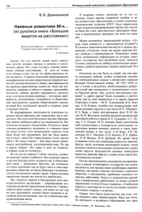 100 Региональный компонент содержания образования В. В. Дранишников Наивные романтики 60-х... (из рукописи книги «Большое видится на расстоянии») Ьылое нельзя воротить и печалиться не о чем: У каждой жохи свои подрастают леса... Ь. Окуджава Думаю, что для многих людей моего поколе­ ния, детство которых прошло в военное и после­ военное время, 60-е годы остались самыми памят­ ными, самыми счастливыми... И дело не только и не столько в том, что на это время пришлась на­ ша молодость. У нашего поколения сформировалась специфическая духовно-нравственная иерархия цен­ ностей, которая включала и общие, признаваемые во все времена нравственные ценности, такие как пат­ риотизм, уважение и забота о стариках, трудолюбие, честность, любовь, дружба, преданность, смелость и др., и не всем сегодня понятные —энтузиазм, жерт­ венность, коллективизм, потребность в обществен­ ной деятельности, наличие общественного идеала, который был путеводной звездой и согревал душу в трудные минуты. На формирование ментальности поколения по­ влияли многие факторы, как социальные, так и лич­ ностные. Мы получили бесплатно высшее образова­ ние, нашли любимую работу по специальности. Нас отличали оптимизм и жизнелюбие. В целом в стране успешно развивалась экономика, и с каждым годом мы жили лучше, хотя материальные запросы тогда были более чем скромными. Для нас было важно, как в песне: «жила бы страна родная, и нету других забот». Но самое главное —всю нашу жизнь прони­ зывала неистребимая, одухотворенная вера. Не зря в народе говорят: «Без веры и дело не спорится, и добрые слова не молвятся». Во что же мы верили? Сейчас читатель, особен­ но молодой, начнет улыбаться. Мы искренне верили в светлое будущее всего человечества, в обществен­ ный идеал — коммунизм. Конечно, мы понимали, что наше поколение еще не будет жить в этом спра­ ведливом обществе, но были убеждены в возможно­ сти его построения в нашей стране. Своим честным творческим трудом мы хотели его приблизить. Мы, педагоги, верили в благородную цель ком­ мунистического воспитания — формирование все­ сторонне развитой гармоничной личности. Справед­ ливости ради следует сказать, что никто до сих пор не смог предложить лучшей, более гуманной и до­ стойной цели воспитания, чем эта утопическая ком­ мунистическая мечта. 1 Великая Отечественная война Советского Союза 1941-1945 гг.: Я искренне считал: несмотря на то что от­ дельные члены партии совершали ошибки и да­ же должностные преступления, в целом социально- экономическая политика КПСС была правильной, и при должном реформировании партии она способ­ на была бы стать действительно авангардом обще­ ства и нравственным примером для всех его граж­ дан. Может возникнуть закономерный вопрос: «От­ куда такая наивность у преподавателя истории?!» Я учился в педагогическом институте в период хру­ щевской «оттепели», когда мы жадно вдыхали воз­ дух свободы и справедливости. Появлялась новая, часто неожиданная информация по истории совет­ ского государства, был разоблачен культ личности Сталина, выходили на свободу политические заклю­ ченные, реабилитировались жертвы репрессий 30-х годов. Поскольку все мы были из семей, так или ина­ че опаленных войной, особое потрясение вызыва­ ли опубликованные данные о репрессиях накануне Великой Отечественной войны. «В 1937-1938 го­ дах и по