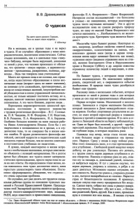 16 Духовность и время В. В. Дранишников О чудесах На свете много разного Горацио, Чего не знают наши мудрецы... У. Шекспир Ни в молодые, ни в зрелые годы я не верил в чудеса. И не случайно: образование у меня мате риалистическое, воспитание атеистическое. Сейчас стыдно вспоминать, как я в школьные годы «заму чил» бабушку, которая была верующей, доказывая «с пеной у рта», что человек произошел от обезья ны, что «религия —опиум народа», а церковнослу жители —проходимцы, развратники, пьяницы, дар моеды. .. Ведь так говорила сама учительница! Много лет прошло пока я не осознал, как страш но, когда недостаточно образованные и плохо вос питанные люди (возраст здесь не имеет значения), не понимая сути сложнейших, противоречивых, до конца не осмысленных явлений, злоупотребляя сво ей убежденостью и плохо управляемой эмоциональ ностью, не только мешают постигать истину, но и, нередко, наносят тяжелые душевные травмы своим оппонентам. А это часто близкие, дорогие люди... Переоценка мировозренческих ценностей про исходила постепенно в процессе знакомства с трудами религиозных философов —В. С. Соловье ва, П. Я. Чаадаева, Н. Ф. Федорова, Г. Н. Федотова, В. В. Розанова, П. А. Флоренского, Н. А. Бердяева. Особенно большое влияние на меня оказали рабо ты Ивана Александровича Ильина. Если бы с его творчеством я познакомился не в зрелые, а в сту денческие годы, то не совершил бы в жизни мно гих ошибок. В трудах религиозного философа жи тейской, светской мудрости и педагогических идей оказалось гораздо больше, чем во многих советских и постсоветских учебниках по педагогике... Я думаю, каждый многократно в жизни встре чался с необычными явлениями, которые невозмож но объяснить с позиций материализма. Но я долгое время был убежден: все чудеса имеют материали стическое происхождение, просто наука пока не да ла на них ответы. На определенном этапе жизни, ко гда накопилось этих чудес достаточно много, меня перестало удовлетворять такое объяснение. Посте пенно сформировалось убеждение, что «чудеса» — это очень серьезная проблема. Не случайно, вот уже десять лет трудится специ альная рабочая группа по описанию чудесных зна мений в Русской Православной Церкви. Председа телем этой Экспертной группы является профессор, доктор геолого-минералогических наук, академик РАЕН, внук известного в православии священника, философа П. А. Флоренского —Павел Флоренский. Интересен состав исследователей —это богословы и ученые —не священники, которые анализируют чудеса чисто научными методами1. Эти и другие исследователи пока не сумели раскрыть природу чудес, но одну из мыслей Павла Флоренского мне хочется напомнить: «...Необъяснимость не являет ся критерием чуда. Критерием чуда является благо дать!» Масштабы чудес бывают разные. Некоторые из них, например, целебные свойства «святой воды», «мирроточение», «слезоточение» на иконах, «об новление» древних икон (когда в церкви почер невшая икона вдруг начинает блестеть как новая), «удвоение икон» (видимое отражение икон на стек ле), явление Благодатного Огня в Иерусалимском храме в Великую Субботу и др. широко известны огромному количеству людей и верующих, и атеи стов. Но бывают чудеса, с которыми люди сталки ваются индивидуально. Их невозможно зафикси ровать, свидетелей нет, а свершившееся событие необъяснимо. В природе таких чудес ра