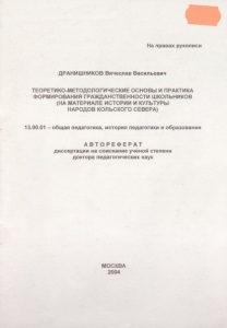 Дранишников, В. В. Теоретико-методологические основы и практика формирования гражданственности школьников (на материале истории и культуры народов Кольского Севера) : 13.00.01 - общая педагогика, история педагогики и образования : автореферат диссертации на соискание ученой степени доктора педагогических наук / Дранишников Вячеслав Васильевич. – Москва : [б. и.], 2004. – 55 с.