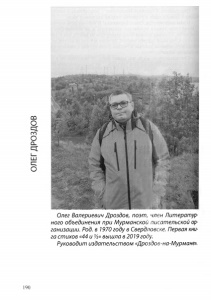 ОЛЕГ ДРОЗДОВ Олег Валериевич Дроздов, поэт, член Литератур ного объединения при Мурманской писательской ор ганизации. Род. в 1970 году в Свердловске. Первая кни га стихов «44 и / 2 » вышла в 2019 году. Руководит издательством «Дроздов-на-Мурмане». 190