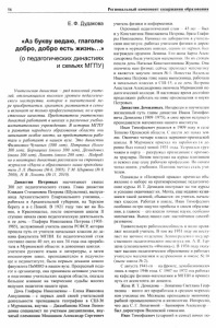 56 Региональный компонент содержания образования Е. Ф. Дудакова «Аз букву ведаю, глаголю добро, добро есть жизнь...» (о педагогических династиях и семьях МГПУ) Учительская династия —ряд поколений учите лей. отличающихся высоким уровнем педагогиче ского мастерства, которое в значительной ме ре приобретается, хранится, развивается в семье и включает не только профессиональные, но и нрав ственные качества. Представитечи учительских династий работают в школах и различных учебно- воспитательных учреждениях. В истории МГПУ и развития народного образования области они занимают особое место, их представители рабо тали и работают в нашем вузе. Это династии Филяновых-Чуниных (500 лет), Петровых (более 300 лет), Бернацких (около 300 лет), Демидовых, (около 200 лет), Локоть (около 200 лет)... Подроб но о некоторых династиях рассказали на страницах журналов «Наука и образование» наши преподава тели Л. Л. Иванова (№6, 2005), Т. М. Ширяева (№9. 2008), Н. В. Локоть (№ 11. 2010). Династия Петровых насчитывает свыше 300 лет педагогического стажа. Глава династии Клавдия Степановна Петрова (Шульгина), выпуск ница Архангельского Епархиального училищ а,— работала в Архангельской губернии, на Терском берегу и в с. Поной. В 1921 году там же на По нос, в Краснощелье, после окончания школы II ступени начала свою педагогическую деятельность и ее дочь —Глафира Николаевна Петрова (1903- 1985), заслуженный учитель школы РСФСР, которая прошла путь от учителя начальных классов до де кана факультета МГПИ. Ее педагогический стаж составил около 40 лет, из них 34 года она прорабо тала в Мурманской области: в довоенных школах учителем русского языка и литературы, а затем инспектором школ, преподавателем в педучили ще и пединституте, была первым деканом нового факультета ПиМНО в нашем вузе. Прекрасный педа гог и организатор, она принимала активное участие в подготовке учительских кадров области, оказала большое влияние на творческие судьбы многих ведущих педагогов нашего края. Дочь Глафиры Николаевны — Елена Ивановна Анкудинова —с первых дней своей учительской деятельности преподавала географию в CLLI-36 г. Мурманска, внучка —Джамбанова Юлия Леони довна специалист по учетным дисциплинам, вну чатый племянник Мошников Александр Сергеевич учитель физики и информатики. Огромный педагог ический стаж 45 лет - был и у Константина Николаевича Петрова, брага Глафи ры Николаевны. Начинал он лаборантом в учитель ском институте, работал учителем физики и дирек тором в мурманских школах, одним из первых был награжден орденом Ленина. Его жена Берга Алек сандровна была учителем математики. По их стопам пошла дочь Наталья Константиновна Жукова. Она окончила наш физмат, сейчас преподаст математику и является завучем лицея № I. Невестка Надежда Ивановна Петрова тоже наша выпускница, работала в начальных классах в СП 1-15, а ее дочь Петрова Анастасия Александровна окончила Мурманский пе дагогический колледж. В настоящее время достойно продолжают работать на ниве просвещения и внуки Петровых. Династия Демидовых. Интересен и поучи телен жизненный путь главы династии Ивана Тимофее вича Демидова (1909 1975), в свое время ведущего преподавателя математики нашего института. Иван Тимофеевич родился в 1909 году в селе Толково Орловской области. С шести лет пахал зем лю. Окончил четыре класса цсрковно-приходской школы. В Мурманск