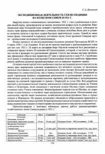 С.А. Дюжилов ЭКСПЕДИЦИОННАЯ ДЕЯТЕЛЬНОСТЬ СЕВЭКСПЕДИЦИИ НА КОЛЬСКОМ СЕВЕРЕ В 1921 Г. Закрутив колеса «нэпмановского локомотива», 1921 г. стал судьбоносным в исто рии нашей науки, предопределив на многие десятилетия вперед пути ее развития. Рево люционная вера большевистских вождей в преобразующую роль науки, побуждала их искать такие формы взаимодействия с учеными, которые способны были дать в услови ях нехватки средств и научных кадров быструю практическую отдачу. Одной из таких новых форм, отвечавшей тогдашнему состоянию науки, была признана Северная науч но - промысловая экспедиция (Севэкспедиция). Начало процессу ее институциализации положило решение Президиума ВСНХ от 4 марта 1920 г. о ее создании. И все же во многом знаковым в организационном плане для нее стал 1921 г. 26 марта на заседании бюро Научной комиссии был рассмотрен и утвержден проект нового Положения об Севэкспедиции, который, в частности, опреде лял состав и функции его руководящих органов. Спустя два месяца научная организа ция официально обрела свое правление (27 мая) и председателя в лице P.JI . Самойлови- ча (2 июня). Сложившаяся конструкция Севэкспедиции позволяла наиболее эффективно решать проблему развития производительных сил на северных окраинах страны. Отличительной чертой этого необычного научно-исследовательского института яв лялась ярко выраженная годичная подвижность его штатного состава: от нескольких десятков (постоянных сотрудников) до нескольких сотен человек (большей частью при глашенных по совместительству лиц в период полевого сезона). Отсюда важнейшей за дачей учреждения являлась координация деятельности ее руководящих центров и хо зяйственных органов с исследовательскими партиями, работавшими в экспедиционном порядке на огромной территории от границ с Норвегией до устья Оби. Вся разработка научной и исследовательской стороны деятельности Севэкспедиции лежала на Ученом совете в Петрограде, тесно связанным с научными силами Москвы (через специально созданное здесь Ученое совещание). Финансирование отрядов шло из Москвы, их снаря жение осуществлялось в основном через центральные учреждения. Обеспечением изы скательских партий также занимались хозяйственно-административные базы в Архан гельске и Мурманске. На первую возлагалась обязанность оборудования транспорта и организации промысловых артелей. Вторая преимущественно оказывала содействие и по мощь мурманским отрядам по переотправке экспедиционного имущества и снаряжения. Проиллюстрируем с помощью табличных данных работу административно хозяйственного звена Севэкспедиции в 1921 г.1 Таблица 1 Структура Штат Содержание Примечание Петроград Начальник, коллегия Канцелярия, управление делами 14 чел. 10 млн. руб. Входящих бумаг - 650, исходящих - 2 500 Финансово-отчетная и хозяйственная части Ученый совет 10 чел. 1,5 млн. руб. Получено и отправлено свыше 6 тыс. пуд. груза Москва Центральное управление Центральная бухгалтерия 11 чел. Нет данных Входящих бумаг - 844, исходящих - 2 778 Получено и отправлено около 3 тыс. пуд. груза Архангельская база 10 чел. 2 млн. руб. Входящих бумаг - 250, исходящих - 800 Мурманская база 5 чел. 3 млн. руб. Получено и отправлено свыше 5 тыс. пуд. груза 150
