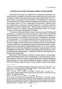 С. А. Дюжилов СЕВЕРНАЯ НАУЧНО-ПРОМЫСЛОВАЯ ЭКСПЕДИЦИЯ Кольский полуостров с его окраинным положением, суровыми кли матическими условиями и малочисленным коренным населением дол гое время оставался малопривлекательным для исследователей. До 1917 г. различными научными организациями (Петербургское общество естествоиспытателей, Финляндское географическое общество и др.) была исследована лишь 1/32 часть территории полуострова1. Причем почти все проведенные изыскания сосредотачивались в западных районах Мурмана или в районе тракта Кола - Кандалакша. Внутренние же части Кольского края и его горные массивы практически никем не посеща лись (за исключением экспедиции В. Рамзая). Положение коренным образом начало меняться после Октябрьской революции, с утверждением советской власти. 4 марта 1920 г. при ВСНХ на базе Комиссии по Северу была создана Северная научно-промысло- вая экспедиция, получившая впоследствии сокращенное название «Севэкспедиция»2. Ее основной задачей являлось осуществление науч но-технических исследований естественных производительных сил Русского Севера3в целях наилучшего их практического использования, а также руководство и координация научно-практических работ, произ водимых всеми органами и учреждениями на местах4. К числу таковых прежде всего относились Полярная экспедиция Академии наук, Русское Географическое общество, Главное Гидрографическое Управление, Глав ная Физическая обсерватория, а также ряд комиссий при наркоматах и центральных ведомствах. Наделение Севэкспедиции особыми полномочиями5и координиру ющими функциями имело свою мотивировку. Советская власть в усло виях нехватки средств и научных кадров предпочитала ориентироваться первоначально на такие организационные формы, которые способны были дать быструю практическую отдачу. Одной из таких новых форм, ' Киселев А.А. Геологоразведочные работы на Кольском полуострове в 1932-1937 гг. и их значение для социалистического преобразования края // Ученые записки МГПИ. - Мур манск, 1964. - Т. 5: Кафедра истории. - С. 186. 2 РГАЭ. - Ф. 3429.-О п . 7 .- Д . 889.- Л . 14; АРАН. - Ф. 544.- O n . 1. - Д. 118. - Л. 2. J Под Русским Севером подразумевалось пространство Европейской и Азиатской России к северу от 60“ северной широты. 4 РГАЭ. - Ф. 3429. - Оп. 7. - Д. 889. - Л. 1; Д. 1098. - Л. 1. 5 В частности, §3 Положения о Севэкспедиции при НТО ВСНХ от 11.09.1920 г. гласил: «Все распоряжения Севэкспедиции, касающиеся регулирования и организации научно- практических исследований на Русском Севере, являются обязательными и подлежат не уклонному исполнению, как частными, так и правительственными и общественными орга низациями» (РГАЭ. - Ф. 3429. - Оп. 7. - Д. 889. - Л. 1). 156
