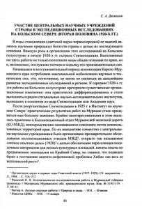 С. А. Дюжилов УЧАСТИЕ ЦЕНТРАЛЬНЫХ НАУЧНЫХ УЧРЕЖДЕНИЙ СТРАНЫ В ЭКСПЕДИЦИОННЫХ ИССЛЕДОВАНИЯХ НА КОЛЬСКОМ СЕВЕРЕ (ВТОРАЯ ПОЛОВИНА 1920-Х ГГ.) В годы становления советской науки первоочередной ее задачей яв­ лялось изучение природных богатств страны с целью их последующего освоения. Важную роль в организации этих исследований на Кольском полуострове в начале 1920-х гг. сыграла Севэкспедиция. Выполненные ею здесь работы не только пополнили наши общие познания по краю, но и, несомненно, послужили толчком к подъему его производительных сил. Начавшаяся в восстановительный период колонизация Карело-Мур- манского края потребовала максимальной мобилизации научных и тех­ нических сил, что, естественно, не могло не сказаться на дальнейшем развитии экспедиционных исследований в регионе. К середине'1920-х гг. эти работы на Кольском полуострове претерпели существенные органи­ зационные изменения: они практически дифференцировались и стали выполняться рядом специальных научно-исследовательских институтов, вышедших в основном из недр Севэкспедиции или Академии наук. После реорганизации Севэкспедиции в 1925 г. в Институт по изуче­ нию Севера1практическим результатам работ на Мурмане стало прида­ ваться еще большее значение. Крайне заинтересованными в этом оказа­ лись правление и Колонизационный отдел Мурманской железной дороги (КО МЖД), непосредственно занимавшиеся освоением почти неисполь­ зованных территорий края. По их инициативе совместно с центральны­ ми научными учреждениями было организовано предварительное обсле­ дование колонизационных отводов МЖД2, открыто так называемое «лесное опытное дело» (1928)3с целью обеспечения переселенцев поса­ дочным материалом для лесных культурных площадей, начаты опыты по продвижению земледелия на Крайний Север, но главное, что подведен базис к постановке апатито-нефелиновой проблемы Хибин «во весь ее исполинский рост»4. 1Организация науки в первые годы Советской власти (1917-1925): Сб. документов. - Л., 1968. - С. 316-317. ; Раевский Н. В. Колонизационно-исследовательская работа в Мурманской губернии (рукопись) // Материалы Мурманского обл. краеведческого музея. Инв. № 5191/1-19. Л. 60-61. 1Риттер А. Лесные опытные работы // Природа и люди. - 1931. ~ 30 июня. 4 Известия ЦИКа. - 1930. - 14 января. 83
