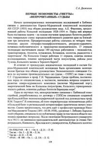 С.А. Дюжилов ПЕРВЫЕ ЭКОНОМИСТЫ «ТИЕТТЫ»: «НЕПРОЧИТАННЫЕ» СУДЬБЫ Начало целенаправленных экономических исследований в Хибинах связано с деятельностью Карело-Мурманской комплексной экспедиции АН СССР (1935) под общим руководством акад. А.Е. Ферсмана, продол жившей работы Кольской экспедиции 1928-1934 гг. Перед ней впервые была поставлена задача - на основе изучения природных богатств разрабо тать генеральную схему народнохозяйственного развития края на ближай шие три пятилетки. Предварительные работы слагались из четырех тема тических циклов: географо-геоморфологического, ресурсно-сырьевого, почвенно-геоботанического и транспортно-экономического. 17 отрядов экспедиции насчитывали свыше 100 научных работников - экономистов, транспортников, геологов, почвоведов, ботаников,зоологов, радиологов и энергетиков1. На Кольском Севере работали 11 отрядов, охватив своими исследованиями, помимо центральной части полуострова, районы реки Тулома, Кольского залива и Терского берега2. В отличие от предыдущих академических экспедиций в составе Ка рело-Мурманской комплексной экспедиции была организована экономи ческая бригада под общим руководством Экономического совещания Со вета по изучению производительных сил (далее - СОПС) во главе с акад. С.Г. Струмилиным и проф. Г.Н. Черданцевым. Среди проблем, поставлен ных перед ее специалистами, в частности, значились вопросы создания и развития северо-мурманского комплекса (включая Мурманский порт), энергетической базы на Кольском полуострове, Кольского горнопромыш ленного района, освоения рыбных богатств Баренцева моря3. Одна из научных тем, непосредственно связанная с Хибинской ново стройкой, разрабатывалась по договору с СОПСом специально созданной при Кольской базе экономгеографической группой под руководством проф. Н.М. Тоцкого4. К сожалению, об этом «первопроходце экономических работ в Кольской базе» в региональной историографии практически ничего неиз вестно. Смеем предположить, что речь идет о профессоре-правоведе Нико лае МаксимовичеТоцком(1891-04.06.1938), уроженце г. Лебедин Харьков ской губернии, специалисте по публичному праву (в том числе в области эко номико-правовых вопросов). После окончания Петроградского университе та в 1913 г. он занимался преподавательской деятельностью (в стенах Пет роградского, Киевского, Ярославского университетов, Кубанского политех- 1 НА КНЦ РАН. - Ф. І.-О п . 6 .-Д . 2 1 .- Л . 42. 2 Там же. - Оп. 5. - Д. 38. - JI. 36. 3 Там же. —Д. 21. —Л. 44. 4 А РАН .-Ф . 188.-O n . 1 .-Д . 330.-Л . 12. 139