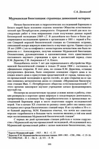 С.А. Дюжилов Мурманская биостанция: страницы довоенной истории Начало биологических и гидрологических исследований Баренцева и Белого морей было положено отделом зоологии Общества естествоиспы­ тателей при Петербургском университете. Отправной точкой для всех по­ следующих работ в этом направлении стали полученные данные первой Беломорской экспедиции (1869 г.) . В дальнейшем все более и более рас­ ширяющиеся исследования привели к организации в 1881 г. первой в Рос­ сии Северной морской биологической станции на Соловецких островах, снискавшей вскоре широкую известность в научных кругах. Однако спустя 18 лет (1899 г.) из-за конфликта с монастырским начальством она была пе­ ренесена в г. Александровск, получив название Мурманской биостанции. Основателями, руководителями и вдохновителями этого единственного постоянного научного учреждения в крае в досоветский период стали К.М. Дерюгин, С.В. Аверинцев и Г.А. Клюге. Понадобилось почти 5 лет для первоначального обустройства Мур­ манской биологической станции и только 29 июня 1904 г. состоялось ее официальное открытие. В этот день, по словам К.М. Дерюгина, «станция разукрасилась флагами, было совершено освещение старого дома и за­ кладка нового дома в присутствии представителей от города, членов науч­ но-промысловой экспедиции и других гостей», ко дню открытия на ее зда­ нии появилась металлическая доска со словами: «Мурманская биологиче­ ская станция Имп. С.-Петербургского общества естествоиспытателей»2. С этого времени заполярное научное учреждение начало функционировать круглый год. Несмотря на исключительно трудные условия жизни и работы, стан­ ция развернула в короткие сроки широкую и плодотворную деятельность, превратившись в основную базу гидробиологических и промысловых ис­ следований Баренцева моря и место подготовки кадров исследователей морей. Уже в начале XX столетия по размаху своих работ она заняла одно из первых мест среди биологических станций мира. И не случайно в 50-е гг. ее бывший директор, М.М. Камшилов отмечал, что почти все советские морские гидробиологи и большая часть зоологов являлись в той или иной мере воспитанниками Мурманской биологической станции3. С первых же дней организации станция работала в тесном содруже­ стве с Мурманской научно-промысловой экспедицией, обследовавшей весь Мурманский промысловый район с целью выяснения биологических, гид­ 1Карело-Мурманский край. - 1927. - № 2. - С. 37. 2Дерюгин К.М. Мурманская биологическая станция. 1899-1905.-СПб., 1906.-С . 25-26. 3НА КНЦ РАН. - Ф. 1. - Оп. 6. - Д. 323. - Л. 38. 195