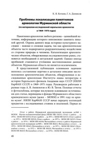 К. Я. Коткин, Г. А. Дзенисов Проблемы локализации памятников археологии Мурманской области (по материалам исследований карельских археологов в 1969-1975 годах) Памятники археологии любого региона - ценнейший ис­ точник, информацию которого невозможно заменить ника­ кой другой. Охрана данного вида историко-культурного на­ следия - важная и сложная задача, так как археологические объекты часто подвергаются разрушительному воздействию со стороны природы и человека. Каталогизация археологи­ ческих объектов, обнаруженных исследователями ранее, ста­ новится необходимой и актуальной задачей. Однако иногда проблемой становится уточнение местоположения данных объектов. Мурманская область не является исключением. В представленной публикации основными задачами являлись составление перечня и детальное описание место­ положения археологических объектов, обнаруженных и ис­ следованных археологами Института языка литературы и истории Карельского филиала Академии наук СССР (ИЯЛИ КарФАН СССР) в 1969-1975 годах. Руководили работами в разные годы А. В. Анпилогов и Ю. В. Титов. Полевые отчеты и фотоальбомы, которые послужили основными источника­ ми для статьи, переведены в фонды Мурманского областного краеведческого музея (далее - МОКМ) в 1991 году из архи­ ва музея1. ИЯЛИ КарФАН СССР начал передачу коллекций предметов с исследованных стоянок и поселений. Первая из Отчет о работе Мурманской археологической экспедиции за1969 г. МОКМ. Научно-вспомогательный фонд (MOM НВ) 5433/1; Отчет о работе ... за 1970 г. МОМ НВ 5433/2; Отчет о работе ... за 1971 г. МОМ НВ 5433/3; Отчет о работе ...з а 1972 г. МОМ НВ 5433/4; Отчет о работе ... за 1973 г. МОМ НВ 5433/5; Отчет о работе ... за 1974 г. МОМ НВ 5433/6; Фотоальбом к отчету о работе Мурманской археологической экспедиции за1969 г. МОМ НВ 3824/1; Фотоальбом к отчету ... за 1970 г. МОМ НВ 3824/2; Фотоальбом к отчету ... за 1971 г. МОМ НВ 3824/3; Фото­ альбом к отчету ... за 1972 г. МОМ НВ 3824/4; Фотоальбом к отчету ... за 1973 г. МОМ НВ 3824/5; Фотоальбом к отчету ... за 1974 г. МОМ НВ 3824/6. 46
