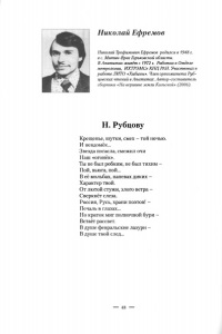 Ефремов Н. Т. Н. Рубцову ; Ответ : [стихи] ; Литературное объединение «Хибины» // Хибинские страницы : литературный альманах / Муницип. бюджет. учреждение культуры «Централиз. библ. система г. Апатиты». - Апатиты, 2012. - С. 48-52 : фот.