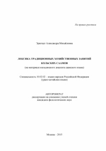 На правах рукописи Эрштадт Александра Михайловна ЛЕКСИКА ТРАДИЦИОННЫХ ХОЗЯЙСТВЕННЫХ ЗАНЯТИЙ КОЛЬСКИХ СААМОВ (на материале кильдинского диалекта саамского языка) Специальность 10.02.02 - языки народов Российской Федерации (урало-алтайские языки) АВТОРЕФЕРАТ диссертации на соискание ученой степени кандидата филологических наук Москва - 2015