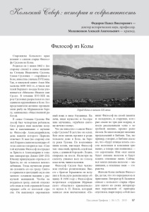 Федоров Павел Викторович — доктор исторических наук, профессор. Малашенков Алексей Анатольевич — краевед. Философ из Колы Город Кола в начале Х Х века Старожилы Кольского края помнят о слепом старце Филосо фе Суслове из Колы. Родился он 1 июня 1862 г. (по старому стилю) в семье мещани на Степана Ивановича Суслова. Семья Сусловых — старейшая в Коле, известна с начала XVII века. Так, в писцовой книге Алая М и халкова 1608-1611 гг., в числе ж и телей Верхнего посада Колы упо минается «Михалко Иванов сын Сусло». В течении XVI-XIX вв. род Сусловых разрастался и стал одним из крупнейших в Коле. Его представители активно промыш ляли рыбу на Мурманском бере гу, занимались общественной ра ботой. В семье Степана Суслова Фи лософ был четвертым ребенком. Свое редкое им я мальчик полу чил в напоминание о мучени ке Философе Александрийском, день памяти которого Церковь отмечает 31 мая (по старому сти лю). В православном календаре об этом святом говорится так: «Свя той мученик Философ пострадал за Христа в Александрии в гоне ние императора Декия (249-251). Юношу принуждали отречься от Христа, но он оставался непоко лебимым. Тогда мучители реши ли склонить его ко греху. Свято го привели в цветущий сад и свя занного оставили наедине с рас путной женщиной. Чтобы не поддаться греху, святой откусил себе язык и этой страшной болью оградил себя от плотской стра сти. Он выплюнул окровавлен ный язык в лицо блудницы. Па лачи, видя мужество и бесстра шие мученика, отрубили свято му мечом голову». Что же известно о самом Фило софе Суслове? В детстве он ослеп. Всю свою жизнь прожил в роди тельском доме в Коле, на бере гу реки Тулома. По воспомина ниям колян, выглядел Философ так: «высокий, прямой, седой как лунь, с длинной бородой». Ходил, опираясь на посох. Несмотря на слепоту, узнавал всех по голосу, клал печи, чинил валенки. Философ Суслов был челове ком глубоко религиозным . Вме сте с братом Герасимом он всту пил в Кольскую религиозную об щину. В 1938 году с Философом встретился сотрудник Мурман ского областного краеведческо го музея А. П. Попов, который записал свои впечатления: «По мнит Философ на своей памяти и «колдунов», и старушек, ко то рые спали по три дня подряд, и после рассказывали «сны о за гробной жизни», крепко рели гиозен. Во многом видит явления предсказаний в Библии. Так, н а пример, говорит, в Библии сказа но, что «будут птицы летать с н о сом железным и конскими гри вами», а теперь они появились — это аэропланы . Или «вся земля будет связана железом и будут ходить огненные змеи». Сейчас вся земля связана железом — м а шинами, а огненные змеи — это ракеты. Жители Колы любили Филосо фа, да так, что это передавалось и приезжим . Литератор В. Балашов списал с кольского старца образ для одного из своих литератур ных персонажей: «С пригорка спустился, шаря перед собой пал Под сенью Трифона | № 1 (7) 2015 97