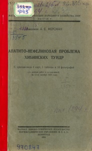 Ферсман, А. Е. Апатито-нефелиновая проблема Хибинских тундр : с прил. 4 карт, 1 табл. и 14 фот.: (по данным работ и исследований на 15 окт. 1929 г.). - Ленинград : Науч. хим.-техн. изд-во: Науч.-техн. упр. ВСНХ, 1929. - 95,[1] с. : ил. - (Материалы по химизации народного хозяйства СССР ; Вып. 5). - Библиогр.: с. 92-93 (19 назв.).