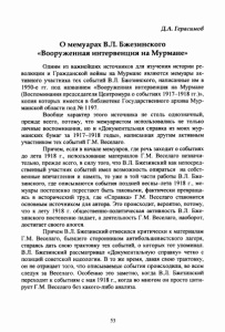 Д.А. Герасимов О мемуарах В.Л. Бжезинского «Вооруженная интервенция на Мурмане» Одним из важнейших источников для изучения истории ре волюции и Гражданской войны на Мурмане являются мемуары ак тивного участника тех событий В.Л. Бжезинского, написанные им в 1950-е гг. под названием «Вооруженная интервенция на Мурмане (Воспоминания председателя Центромура о событиях 1917-1918 гг.)», копия которых имеется в библиотеке Государственного архива Мур манской области под № 1197. Вообще характер этого источника не столь однозначный, прежде всего, потому, что мемуаристом использовались не только личные воспоминания, но и «Документальная справка из моих мур манских бумаг за 1917-1918 годы», написанная другим активным участником тех событий Г.М. Веселаго. Причем, если в начале мемуаров, где речь заходит о событиях до лета 1918 г., использование материалов Г.М. Веселаго незначи тельно, прежде всего, в силу того, что В.Л. Бжезинский как непосред ственный участник событий имел возможность опираться на собст венные впечатления и память, то уже в той части работы В.Л. Бже зинского, где описываются события поздней весны-лета 1918 г., ме муары постепенно перестают быть таковыми, фактически превраща ясь в исторический труд, где «Справка» Г.М. Веселаго становится основным источником для автора. Это происходит, вероятно, потому, что к лету 1918 г. общественно-политическая активность В.Л. Бже зинского постепенно падает, а деятельность Г.М. Веселаго, наоборот, достигает своего апогея. Причем В.Л. Бжезинский относился критически к материалам Г.М. Веселаго, бывшего сторонником антибольшевистского лагеря, стараясь дать свою трактовку тех событий, о которых тот упоминал. В.Л. Бжезинский рассматривал «Документальную справку» четко с позиций советской идеологии. В то же время, давая свою трактовку, он не отрицает того, что описываемые события происходили, во всем следуя за Веселаго. Особенно это заметно, когда В.Л. Бжезинский переходит к событиям с мая 1918 г., когда во многом он просто цити рует Г.М. Веселаго без какого-либо анализа. 53