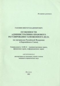 Головин, В. В. Особенности административно-правового регулирования таможенного дела : (по материалам Российской Федерации и Европейского Союза) : специальность 12.00.14 - Административное право, финансовое право, информационное право : автореферат диссертации на соискание ученой степени кандидата юридических наук / Головин Виктор Владимирович. – Москва : [б. и.], 2002. – 30 с. : ил. – На правах рукоп.