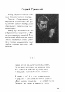 Сергей Гронский Актер Мурманского област ного драматического театра. Окончил Саратовский ун и верситет (геологический фа культет), затем театральный факультет Саратовской кон серватории. Автор двух поэтических книг («Критический возраст» и «Ин терпретация открытий»), В по вседневной обыденности нашей жизни старается найти красо ту и поэзию и рассказать о них людям стихами простого собе седника. * * * Наше время не дарит великих людей, Ни великих творцов, ни желания петь. Мы теряемся в облаке мутных идей И ведущим понятием стало «иметь», Я имею, а ты? А в душе «трын-трава» И рефлекс - обязательно что-то украсть. «Друг', оставь покурить» —а в ответ голова Повернет не лицо, а звериную пасть. 33