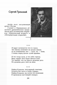 Сергей Гронский Актёр, поэт, заслуженный артист России. Служит в Мурманском об ластном драматическом театре. Автор двух поэтических сборни ков: «Критический возраст» и «Интерпретация открытий». X X X И вдруг начинается что-то такое, Что жизнь изменяет на целую жизнь. И ты понимаешь: вот — поле, ты — воин, Стоишь перед целою тучей вражин. И что тогда пули, и что тебе стрелы, Ведь сердце твое будет биться пока Ты знаешь, что ты просто делаешь дело. Но делаешь дело свое на века. * X X Майор Ковалев, титулярный советник, Остался без носа и очень страдал. Майор Ковалев, вы почти что изменник И произвели настоящий скандал: 201