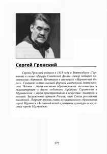 Сергей Г р о н с к и й _________________ Сергей Гронский родился в 1955 году в Виттенберге (Гер мания) в семье офицера Советской Армии. Автор четырёх по этических сборников. Печатался в альманахе «Мурманский бе рег». Считает поэзию высшей формой умственной деятельно сти. Человек с двумя высшими образованиями: техническим и гуманитарным; с двумя любимыми городами: Саратовом и Мурманском; с двумя пристрастиями в искусстве: театром и поэзией. Заслуженный артист России, член Союза российских писателей. Лауреат премии главы муниципального образования город Мурманск «За личный вклад в развитие культуры и искус ства города Мурманска». 172