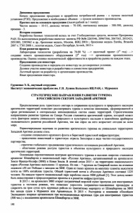 Динамика предложения Начало предложения продукции и проработка потребностей рынка - с пуском пилотной установки (РЭП). Предложение в необходимых объемах - с пуском основного производства. Прогноз цен на основную продукцию (тысяч рублей за 1 тонну) Чистое железо - 10-15, диоксид титана - 70-100, пентаоксид ванадия - 300-500, диоксид кремния - 3. История создания Разработка базовых технологий велась за счет Госбюджетных средств, включая Программы РАН. По выполненным разработкам имеются: патенты РФ№№ 2263546, 20967566, 2067565, 2052421, 2051003, 2385962 и др.; бронзовая медаль, Москва, ВВЦ 2001г.; бронзовая медаль Eureka, Brussels 2007 г; ТЭО 2008 г.; золотая медаль, Санкт-Петербург, hi-tech, 2013 г. План развития проекта Лабораторная технология (разработана на 70-80 %) —> пилотный проект (Iй год) —> создание нового промышленного оборудования (2й год) —■> организация промышленного производства. Оценка технико-экономической эффективности и проработка рынка на каждом этапе. Предложения для инвестора Создание производства и передача его инвестору на договоренных условиях. Долевое участие инвестора и разработчика в совместном предприятии. Льготный кредит на разработку и организацию производства. Иные предложения инвестора. Грушенко Э. Б., научный сотрудник Институт экономических проблем им. Г.П. Лузина Кольского НЦ РАН, г. Мурманск СТРАТЕГИЧЕСКИЕ НАПРАВЛЕНИЯ РАЗВИТИЯ ТУРИЗМА В РОССИЙСКОМ СЕКТОРЕ ЗАПАДНОЙ АРКТИКИ Предполагаемая роль туристского сектора в сохранении культурного и природного наследия арктических территорий позволяет рассматривать туризм в качестве инновации, сформированной в среде региональных и секторальных инновационных систем самих территорий. Стратегическим направлением развития туризма на Севере России становится арктический туризм, который может стать фактором защиты уникального природного и культурного наследия и важнейшим драйвером экономического развития российской Арктики, так как спрос на него возрастает сегодня во всем мире. Первоочередными задачами по развитию арктического туризма на уникальных территориях Западной Арктики должны стать: - создание специального круизного флота и береговой туристской инфраструктуры; - привлечение инвестиций в туристскую отрасль Заполярья в виде частно-государственного партнерства; - стратегия глобального продвижения туристического потенциала российской Арктики; - облегчение режима доступа туристов к объектам культурного и природного наследия арктических территорий. Основными перспективными центрами арктического туризма в высоких широтах становятся архипелаг Шпицберген и национальный парк «Русская Арктика», организованный на архипелагах Земля Франца-Иосифа (ЗФИ) и Новая Земля. В летний сезон 2015 г. на территорию национального парка «Русская Арктика» выполнено 11 круизов. Из них - 7 круизов на Северный полюс на атомном ледоколе «50 лет Победы» с заходом на ЗФИ. Один из таких круизов на макушку планеты выкупили почти на 100% китайские туристы. Общий туристский поток в «Русскую Арктику» составил 1225 человек. На каждом туристе национальный парк заработал около 5000 рублей [1]. Этот доход может быть инвестирован в природоохранные проекты и в развитие инфраструктуры. В 2015 г. на архипелаге ЗФИ открыт пограничный морской пункт пропуска для иностранных туристов в тестовом режиме, что позволяет упростить погранично-тамож