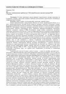 АНАЛИЗ РАЗВИТИЯ ТУРИЗМА НА СОЛОВЕЦКИХ ОСТРОВАХ Грушенко Э. Б. н.с. Институт экономических проблем им. Г.П.Лузина Кольского научного центра РАН г. Апатиты Аннотация: В статье произведен анализ развития туристического сектора экономики на Соловецких островах, определены основные проблемы использования туристического потенциала и инфраструктуры Соловков. Ключевые слова: Соловки, музей-заповедник, монастырь, морской туризм. Самым привлекательным туристическим объектом не только Архангельской области, но и всего Западно-арктического региона России являются всемирно известные Соловецкие острова. Культурно-исторический комплекс Соловецкого монастыря включен в Список всемирного наследия ЮНЕСКО. Высочайший туристский потенциал архипелага состоит из многочисленных историко архитектурных объектов монастырской эпохи, уникальных природно-ландшафтных памятников, объектов «лагерного» периода СЛОН (Соловецкого лагеря особого назначения), редчайших сакральных памятников эпохи неолита. Только на территории поселка Соловецкий сконцентрировано около 100 объектов культурного наследия, из них 17 культовых сооружений. В настоящий период в поселке открыто для посещения 15 музеев и выставочных залов, из них 10 - на территории кремля. Практически все население архипелага проживает в пос.Соловецкий - 932 человека, в монастыре постоянно проживают около 100 человек, включая трудников (из них 69 монахов и послушников). Основным градообразующим предприятием на Соловках является музей-заповедник, создавший 160 рабочих мест из 450 имеющихся в поселке. Соловецкий музей-заповедник совместно с паломнической службой монастыря организовал около 20 экскурсионно-туристических программ и маршрутов. Помимо монастырского Кремля, большой популярностью у туристов пользуются экскурсии по озерно-канальной системе, в ботанический сад, Белужий мыс, Секирную гору (скит передан Русской православной церкви), морские прогулки на Заяцкие острова и остров Анзер (территория передана РПЦ). В 2009 г. была обустроена экологическая тропа протяженностью 6 километров к Белужьему мысу, где туристы могут понаблюдать за белухами со специальной смотровой вышки. Туристический сезон на Соловках длится 4 месяца - с июня по сентябрь, высокий сезон - июль-август. Максимальный пик туристской посещаемости приходится на период с 10 по 23 августа, на время проведения основных соловецких событийных мероприятий (фестиваль авторской песни и главные православные монастырские праздники Преображения и Соловецких святых). В этот период без предварительного бронирования крайне тяжело найти место проживания, когда не бывает свободных мест в гостиницах, общежитиях, частном секторе. В летний туристический сезон практически все местные жители задействованы в туристическом бизнесе, сдавая все свободные помещения в доме для туристов и паломников по цене от 400 до 1000 руб. с человека. Развитие туризма на Соловках позволило увеличить заработки местного населения. Однако на доходы бюджета Приморского района, к которому относятся Соловки, это никак не повлияло. Доходы местного бюджета увеличатся, если местные жители будут официально зарабатывать деньги, сдавая своё жильё и продавая туристам сувениры и выловленную рыбу, с отчислением налогов, оформив индивидуальное предпринимательство. Некоторые пр