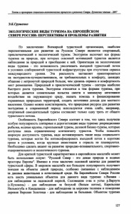Э.Б.Грушенко ЭКОЛОГИЧЕСКИЕ ВИДЫ ТУРИЗМАНА ЕВРОПЕЙСКОМ СЕВЕРЕ РОССИИ: ПЕРСПЕКТИВЫИПРОБЛЕМЫРАЗВИТИЯ По заключению Всемирной туристской организации, наиболее перспективными для развития на Русском Севере являются спортивный, приключенческий и экологический туризм. Экотуризм включает все формы туризма на природе, при которых основной мотивацией туристов является наблюдение за природой и приобщение к ней. Ориентация на экологические виды туризма - это возможность увеличивать въездной туристский поток в условиях слаборазвитой туристской инфраструктуры при отсутствии сервиса международного уровня. Эта реальность заставляет ориентироваться на экотуристов-путещественников, не требовательных к комфорту, ценящих общение с нетронутой природой больше, чем уровень сервиса и комфортность мест размещения. Природный и приключенческий туризм - секторы наиболее быстрого роста туризма. Экотуризм относится к тем формам туризма, при которых делается сознательная попытка свести к минимуму негативное воздействие на окружающую среду, оказать помощь в финансировании охраняемых природных территорий, создать источники дохода для местного населения. Однако можно констатировать, что природные ресурсы для развития экотуризма в современный период используются очень слабо, например, спортивный самодеятельный туризм составляет только одну треть от общего туристского потока. Особенность Европейского Севера состоит в том, что здесь получили особую популярность элитарные и дорогостоящие виды туризма: рекреационная рыбалка, водные круизы, горнолыжный туризм, деловой бизнес-туризм, которые доступны лишь ограниченному контингенту туристов. Чтобы повысить широкую доступность туризма, надо активизировать такие виды социального туризма, которые могли бы интенсифицировать въездной поток в короткие сроки в условиях, когда крупные инвестиции в отрасль не планируются. Необходимо сделать акцент на развитие природно-познавательного, спортивно- оздоровительного и экологического туризма. Для краткой туристской характеристики в европейском масштабе может быть использован лозунг: "Русский Север - это дикая природа и водные просторы Европы". Именно в этом заключен основной капитал для развития туристской сферы. В мировом масштабе все большую популярность получают поездки на объекты дикой природы, особенно связанные с наблюдением за дикими животными в естественной среде. На Европейском Севере России есть шесть уникальных объектов для данного вида туризма: о.Валаам - для наблюдения за ладожской нерпой, Соловецкие о-ва и устье р.Варзуга (с.Кузомень) - для наблюдения за белухой (белым китом), Карельская Нильмогуба и Кандалакша - для наблюдения за морским тюленем и поморская деревня Верхняя Золотица - для наблюдения за бельками. Объектом туризма
