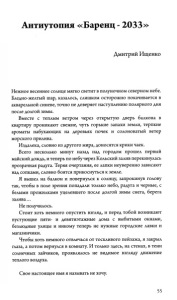 Антиутопия «Баренц - 2033» Дмитрий Ищенко Нежное весеннее солнце мягко светит в полуночном северном небе. Бледно-желтый шар, казалось, слишком осторожно покачивается в акварельной синеве, точно не доверяет наступлению полярного дня после долгой зимы. Вместе с теплым ветром через открытую дверь балкона в квартиру проникают свежие, чуть горькие запахи земли, терпкие ароматы набухающих на деревьях почек и солоноватый ветер морского прилива. Издалека, словно из другого мира, доносятся крики чаек. Всего несколько минут назад над городом прошел первый майский дождь, и теперь по небу через Кольский залив перекинулась прозрачная радуга. Теряя очертания, ее лапки неуверенно зависают над сопками, словно боятся прикоснуться к земле. Я вышел на балкон и повернулся к солнцу, запрокинув голову так, чтобы в поле зрения попадали только небо, радуга и черные, с белыми прожилками уцелевшего после долгой зимы снега, берега залива... Не получилось. Стоит хоть немного опустить взгляд, и перед тобой возникают пустующие пяти- и девятиэтажные дома с выбитыми окнами, безлюдные улицы и никому теперь не нужные городские лавки и магазинчики. Чтобы хоть немного отвлечься от тоскливого пейзажа, я закрыл глаза, а потом вернулся в комнату. И только здесь, на стенах, в тени солнечных зайчиков, проявлялось не видимое взгляду движение теплого воздуха. Свое настоящее имя я называть не хочу. 55