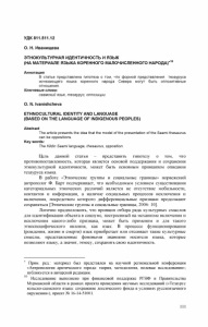 УДК 811.511.12 О. Н. Иванищева ЭТНОКУЛЬТУРНАЯ ИДЕНТИЧНОСТЬ И ЯЗЫК (НА МАТЕРИАЛЕ ЯЗЫКА КОРЕННОГО МАЛОЧИСЛЕННОГО НАРОДА)*10 Аннотация В статье представлена гипотеза о том, что формой представления тезауруса исчезающего языка коренного народа Севера могут быть оппозитивные отношения. Ключевые слова: саамский язык, тезаурус, оппозиции. О. N. Ivanishcheva ETHNOCULTURAL IDENTITY AND LANGUAGE (BASED ON THE LANGUAGE OF INDIGENOUS PEOPLES) Abstract The article presents the idea that the model of the presentation of the Saami thesaurus can be oppositions. Key words: The Kildin Saami language, thesaurus, opposition. Цель данной статьи - представить гипотезу о том, что противопоставленность, которая является основой поддержания и сохранения этнокультурной идентичности, может быть основным принципом описания тезауруса языка. В работе «Этнические группы и социальные границы» норвежский антрополог Ф. Барт подчеркивает, что необходимым условием существования категориальных этнических различий является не отсутствие мобильности, контактов и информации, а наличие социальных процессов исключения и включения, посредством которого дифференциальные признаки продолжают сохраняться [Этнические группы и социальные границы, 2006: 10]. Логично предположить, что принцип отбора ряда культурных смыслов для идентификации объекта в социуме, построенный на механизме включения и исключения какого-либо признака, может быть применим и для такого этноспецифического явления, как язык. В процессе функционирования (рождения, жизни и смерти) язык приобретает или отсеивает такие культурные смыслы, представленные фоновыми знаниями носителя языка, которые позволяют языку, а значит, этносу, сохранить свою идентичность. Прим. ред.: материал был представлен на научной региональной конференции «Антропология арктического города: теория, методология, полевые исследования»; публикуется в авторской редакции. 10 Исследование выполнено при финансовой поддержке РГНФ и Правительства Мурманской области в рамках проекта проведения научных исследований («Тезаурус кольско-саамского языка: сохранение лексического фонда в условиях русскоязычного окружения»), проект № 16-14-51001. 111