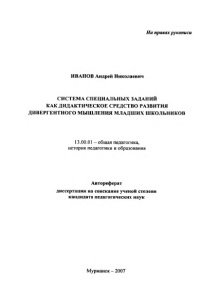 На правахрукописи ИВАНОВ Андрей Николаевич СИСТЕМА СПЕЦИАЛЬНЫХ ЗАДАНИЙ КАК ДИДАКТИЧЕСКОЕ СРЕДСТВО РАЗВИТИЯ ДИВЕРГЕНТНОГО МЫШЛЕНИЯ МЛАДШИХ ШКОЛЬНИКОВ 13.00.01 - общая педагогика, история педагогики и образования Автореферат диссертации на соискание ученой степени кандидата педагогических наук Мурманск - 2007
