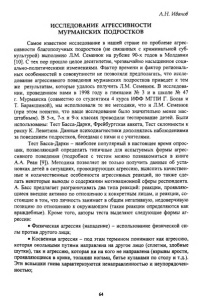 А.Н. Иванов ИССЛЕДОВАНИЕ АГРЕССИВНОСТИ МУРМАНСКИХ ПОДРОСТКОВ Самое известное исследование в нашей стране по проблеме агрес­ сивности благополучных подростков (не связанных с криминальной суб­ культурой) выполнено Л.М. Семенюк на рубеже 90-х годов в Молдавии [10]. С тех пор прошло целое десятилетие, чрезвычайно насыщенное соци­ ально-политическими изменениями. Фактор времени и фактор региональ­ ных особенностей в совокупности не позволяли предполагать, что иссле­ дование агрессивного поведения мурманских подростков приведет к тем же результатам, которые удалось получить Л.М. Семенюк. В исследова­ нии, проведенном нами в 1998 году в гимназии № 3 и в школе № 47 г. Мурманска (совместно со студентами 4 курса ИФФ МГПИ Г. Босак и Т. Баракшиной), мы использовали те же методики, что и Л.М. Семенюк (при этом понятно, что наше исследование было значительно менее мас­ штабным). В 5-х, 7-х и 9-х классах проводили тестирование детей. Были использованы: Тест Басса-Дарки, Фрейбургская анкета, Тест склонности к риску К. Левитина. Данные психодиагностики дополнялись наблюдениями за поведением подростков, беседами с ними и с учителями. Тест Басса-Дарки - наиболее популярный в настоящее время опрос­ ник, позволяющий определить типичные для испытуемых формы агрес­ сивного поведения (подробнее с тестом можно познакомиться в книге А.А. Реан [9]). Методика позволяет не только получить данные об уста­ новках детей в ситуациях, провоцирующих агрессию, выяснить качествен­ ные и количественные особенности агрессивных реакций, но также сде­ лать некоторые выводы о содержании мотивационной сферы респондента. А. Басс предлагает разграничивать два типа реакций: реакции, проявляю­ щиеся внешне активно по отношению к конкретным лицам, и реакции, со­ стоящие в том, что личность занимает в общем негативную, недоверчивую позицию по отношению к окружающим (такие реакции определяются как враждебные). Кроме того, авторы теста выделяют следующие формы аг­ рессии: • Физическая агрессия (нападение) - использование физической си­ лы против другого лица; • Косвенная агрессия - под этим термином понимают как агрессию, которая окольными путями направлена на другое лицо (сплетни, злобные шутки), так и агрессию, которая ни на кого не направлена (взрывы ярости, проявляющиеся в крике, топании ногами, битье кулаками по столу и т.д.). Эти вспышки гнева характеризуются ненаправленностью и неупорядочен­ ностью; 64