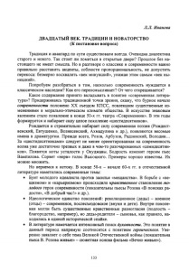 II.Л. Иванова ДВАДЦАТЫЙ ВЕК. ТРАДИЦИИ И НОВАТОРСТВО (К постановке вопроса) Традиция и авангард по сути существовали всегда. Очевидна диалектика старого и нового. Так стоит ли ломиться в открытые двери? Прошлое без на стоящего не имеет смысла. Но в разговоре о классике и современности важно правильно расставить акценты, соблюсти пропорциональность, не допустить перекоса: безмерно восхвалять «век минувший», унижая этим самым «век ны нешний». Попробуем разобраться в том, насколько современность нуждается в классическом наследии? Как его переосмысливает? От чего открещивается? Какое содержание принято вкладывать в понятие «современная литера тура»? Придерживаясь традиционной точки зрения, скажу, что бурное начало современности положено XX съездом КПСС, повлекшим существенные из менениями в морально-этическом климате общества. В искусстве знаковым явлением стало появление в конце 50-х гг. театра «Современник». В эти годы формируется и набирает силу целое поколение «шестидесятников». Рождается и стремительно набирает силу современная поэзия (Рождест венский, Евтушенко, Вознесенский, Ахмадулина и др.), появляются весомые имена в драматургии. Прежде всего, Розов, Арбузов, Радзинский, Володин... За «шестидесятниками» следует не менее ориентированная на современность волна уже достаточно трезвых и даже в чем-то разочарованных «семидесятни ков». Появятся ноты усталости у Окуджавы, Бодрость изменит героям пьес Вампилова. Сорвет «нерв» голос Высоцкого. Примеры хорошо известны. Их можно множить. Но вернемся к истоку. В конце 50-х - начале 60-х гг. в отечественной литературе наметились современные темы: • Бунт молодого идеалиста против засилья «мещанства». В борьбе с «ве щизмом» и «карьеризмом» происходило нравственное становление мо лодого героя современности (показательны пьесы Розова «В поисках ра дости», «В добрый час!» и др.). • Идеологическое единство поколений: революционное (деды) - военное (отцы) - современное, послесъездовское (внуки и дети). Внутри поколе ния могли быть существенные нравственные разногласия (подлость - благородство, например), но деды-родители - сыновья, как правило, на ходились в единой исторической спайке. • В литературе намечается интенсивный поиск духовности. Это понятие в данный период напрямую соотносится с понятием героического. Уве ренно заявляет о себе тема Великой Отечественной войны (показательна пьеса В. Розова живые» - сюжетная основа фильма «Вечно живые»). 133