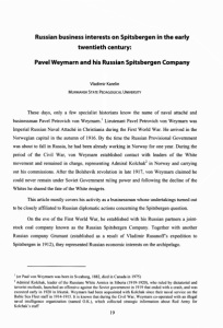 Karelin, V. Russian business interests on Spitsbergen in the early twentieth century: Pavel Weymarn and Russian Spitsbergen Company // Norway and Russia in the Arctic : conference proceeding from international conference «Norway and Russia in the Arctic», Longyearbyen, 25-28 August 2009 / S. Bones, P. Mankova. – Tromso, 2010. – S. 19-27. – (Speculum boreale. The Publication Series of the Department of History and Religious Studies University of Tromso ; № 12).
