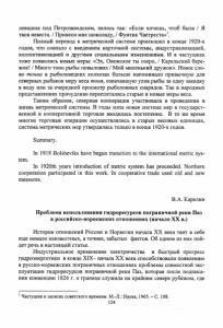 левщина под Петрозаводском, пелось так: «Если хочешь, чтоб была / Я твоя невеста. / Принеси мне шоколаду, / Фунтик Чаетреста»1. Полный переход к метрической системе произошел в конце 1920-х годов, что совпало с введением карточной системы, индустриализацией, коллективизацией и другими социальными изменениями. И в частушках тоже появились новые меры: «Эх, Онежское ты озеро, / Карельский бере жок! / Много тонн рыбы повыловил / Мой миленький дружок». Новое сло во тонна в рыболовецких колхозах больше напоминало привычную для северных рыбаков меру веса тоня, означавшую улов рыбы за одну закидку в воду или за очередной просмотр рыболовных снарядов. Так в народных представлениях причудливо переплетались старые и новые меры веса. Таким образом, северная кооперация участвовала в проведении в жизнь метрической системы. В годы нэпа новая система мер в государст венной и кооперативной торговле вводилась постепенно. В то же время многие торговые операции осуществлялись в старых весовых единицах, система метрических мер утвердилась только в конце 1920-х годов. Summary. In 1918 Bolsheviks have begun transition to the international metric sys tem. In 1920th years introduction of metric system has proceeded. Northern cooperation participated in this work. In cooperative trade used old and new measures. B.A. Карелин Проблема использования гидроресурсов пограничной реки Паз в российско-норвежских отношениях (начало XX в.) История отношений России и Норвегии начала XX века таит в себе еще немало неизвестных, а точнее, забытых фактов. Об одном из них пой дет речь в настоящей статье. Индустриальное применение электричества и быстрый прогресс гидроэнергетики в конце XIX- начала XX века способствовали появлению в русско-норвежских пограничных отношениях проблемы совместной экс плуатации гидроресурсов пограничной реки Паз, которая после подписа ния конвенции 1826 г. о границе служила на крайнем севере рубежом, где 1Частушки в записях советского времени. М.-Л.: Наука, 1965. - С. 108. 124