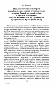В.А. Карелин Новый источник по истории российской дипломатии в Скандинавии периода Первой мировой войны и русской революции: письма посланника К.Н. Гулькевича профессору О. Броку (1916-1921) Объективное освещение успехов и проблем русской диплома­ тии в сложный, переходный период от Первой мировой войны к русской революции зависит во многом от расширения Источнико­ вой базы исследований, в том числе за счет, как показывает опыт, обширного массива документов, в разное время и по разным об­ стоятельствам оказавшихся в зарубежных архивохранилищах1. Из них опубликована и стала доступной историкам пока лишь небольшая часть2. Тем интереснее находки рукописных материалов в библио­ теках и архивных собраниях тех Скандинавских стран, где дей­ ствовали российские дипломаты, отказавшиеся признать утвер­ дившуюся в октябре 1917 г. советскую власть. Именно такое открытие ждало нас в Национальной библиотеке в Осло3. Здесь, в рукописном отделе, хранится обширный личный фонд извест­ ного норвежского филолога-слависта, переводчика, публициста и общественного деятеля профессора Олафа Брока4. Как человека либерального умонастроения, стремившегося к участию в общественной деятельности и как «русофила», Брока с 1890-х увлекла мечта в меру своих сил содействовать поднимав­ шейся тогда в России новой волне освободительного движения. Он полагал, что трансформация («перемена системы правления в России») станет именно тем решительным средством, которое откроет дорогу сближению Норвегии и России, чему он искренне и с радостью желал посвятить свою жизнь. В решении этой по­ истине исторической задачи, как он думал, заключено его настоя­ щее призвание. Известно, что Брок начиная с конца 1880-х годов поддержи­ вал связи с широким кругом академических и общественных дея­ телей в России. Среди них были известные ученые, дипломаты и политики. Именно по этой причине в личном архиве норвежского ученого среди прочих оказались документы, происхождение кото- 2,59 19 Зак. 3672