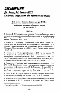 ЕШЕТДВИТЕЛИ: Д.П. Веляев, В.Д. Карелии ІМПУІ, ЕАВрвхвва [Мурманские вВл. краевелчеекий мцзейі К 10-летию «Вестника Баренц-центра МГТУ»: библиография публикаций мурманских историков по истории российско-норвежских связей (за 2005-2010 гг.)1 2005 год 1. Беляев, Д. П. Государственная политика России в области изучения и освоения архипелагов акватории Баренцева моря во второй половине XIX - первой трети XX веков : дис. ... канд. ист. наук : 07.00.02 / Д. П. Беляев. - Мурманск, 2005. - 210 с. 2. Беляев, Д. П. К вопросу о колонизации Новой Земли в конце XIX - первой трети XX века (в свете русско-норвежских отношений) / Д. П. Беляев // Ученые записки МГПУ. Исторические науки : [сб. науч. ст.]. - Мурманск : Мурм. гос. ред. ун-т, 2005. - Вып. 5: Отечественная история. -С.157-165. 3. Порцель, А. К. «Свальбардский вопрос» в 1920 г. и его решение / А. К. Порцель // Материалы Международной научно-технической конференции "Наука и образование - 2005" : [Мурманск, 6-14 апр. 2005 г.] : (в 7 ч.) / Федер. агентство по рыболовству, Мурм. гос. техн. ун-т. - Мурманск : Мурм. гос. техн. ун-т, 2005. - Ч. 1. - С. 278-281. 4. Порцель, А. К. Торговые связи Финнмарка и Русского Севера в 1917- 1920 гг.// II Ушаковские чтения : материалы науч.-практ. межрегион, ист.-краевед. конф. памяти проф. И. Ф. Ушакова, 2-4 марта 2005 г. / Федер. агентство по образованию [и др. ; редкол.: А. В. Воронин (науч. ред.) и др.]. - Мурманск : Мурм. гос. пед. ун-т, 2005. - С. 162-166. 5. Portzel, А. The Norwegian Colonists in Murman during the Soviet Period / A. Portzel // In the Nord my Nest is Made. - SPb., 2005. - P. 145-166. 6. Федоров, П. В. Российское государство и Кольский Север: притяжение и отталкивание / П. В. Федоров // Живущие на Севере: вызов 1Редактор библиографии - Е.Р. Михайлова, сотрудница МГОУНБ. 189