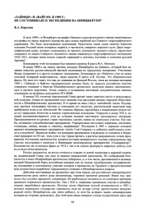 «ТАЙМЫР» И «ВАЙГАЧ» В 1909 Г.: НЕ СОСТОЯВШАЯСЯ ЭКСПЕДИЦИЯ НА ШПИЦБЕРГЕН* В.А. Карелин К лету 1909 г. в Петербурге на верфях Невского судостроительного завода заканчивалась постройка по заказу морского ведомства двух новых кораблей для Главного гидрографического управления. Это было долгожданное пополнение. Недостаток таких судов заметно тормозил освоение Россией своих полярных морей и, в частности, северного морского пути. Двум гидро­ графическим судам, которые сооружались по проекту усиленного ледового класса, предстояло совершить по морям Северного ледовитого океана знаменитую гидрографическую экспедицию 1910-1915, которая затем вошла славной страницей в летопись изучения и освоения русской Арктики1. Командиром этой экспедиции был назначен капитан II ранга Ф.А. Матисен. В конце 1890-х он, между прочим, посещал Шпицберген на «Бакане», который был на­ значен помогать русско-шведской научной экспедиции по градусному измерению. Участвовал Федор Андреевич и в других полярных экспедициях. Командиром же «Вайгача» стал не менее опытный полярный мореплаватель, также капитан II ранга А.В. Колчак. Это общеизвестные факты. Но мало кто знает, что еще до плавания на Дальний Восток, теми же летними месяцами 1909 г. «Таймыр» и Вайгач» предварительно должны были, по замыслу российских властей, совершить плавание к берегам Шпицбергенского архипелага, выполняя важное дипломатиче­ ское и научное поручение. Этому сюжету и посвящены настоящие документальные заметки, основанные на архивных документах РГА ВМФ. В начале XX столетия Арктический Север прочно занял заметное место в международ­ ной политике. Одним из проявлений этого явления стал растущий интерес мировой обществен­ ности к Шпицбергенскому архипелагу. В то время он имел статус «ничейной» земли. Регуляр­ ные научные экспедиции изучали и описывали его геологию, растительный животный мир, прибрежные воды и их обитателей. Но главным образом, европейцев и американцев влекли сю­ да его природные богатства и важное стратегическое положение. Открытие в конце XIX в. за­ лежей высококачественного угля на островах вызвало настоящую грюндерскую лихорадку. Предприниматели из разных стран торопились сделать заявки на земельные участки. Как гри­ бы, возникали угледобывающие предприятия. Учредителями выступили норвежцы, англичане, голландцы, шведы, немцы и, наконец, американцы2. Последние в 1905 г. первыми основали крупное механизированное предприятие «Arctic Coal Company» и добились наибольшего успе­ ха в угледобыче3. Накануне войны эта компания производила и вывозила (в основном в Норве­ гию) примерно по 50 тыс. тонн угля в год. Среди прочего, в расчеты американских хозяев пред­ приятия, бостонских капиталистов, входила поставка минерального топлива учрежденному при участии иностранного капитала в Финнмарке железорудному предприятию «Сюдварангер»4. Большинство же остальных фирм до 1914 г. так и не сумели развернуть широкую добычу угля из-за недостатка капиталов. Россия, разумеется, не могла остаться в стороне от новой тенденции в мировой полити­ ке, выдвинувшей Север, как одно из важных направлений дипломатии. Из соображений безо­ пасности и имея обширнейшее арктическое побережье, и, в том числе, протяженный и незамер­ зающий Мурманский берег, российская империя уже по своему своеобразному географическо­ му 