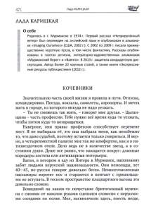 471 Лада КАРИЦКАЯ ЛАДА КАРИЦКАЯ "; О себе Родилась в г. Мурманске в 1974 г Первый рассказ «Неприручённый ветер» был переведен на английский язык и опубликован в альмана хе «Imaging Ourselves» (США, 2002 г.). С 2002 по 2009 г. писала преиму щественно короткую прозу, в том числе фантастику. Рассказы опубли- й кованы в газетах региона, литературно-художественных альманахах ■ «Мурманский берег» и «Ваенга». В 2013 г. защитила кандидатскую дис сертацию. Автор более 20 научных статей, а также книги «Экспрессив ные ресурсы публицистики» (2012 г.). КОЧЕВНИКИ Значительную часть своей жизни я провела в пути. Отпуска, командировки. Поезда, вокзалы, самолеты, аэропорты. И мечта жить в городе, из которого никуда не надо уезжать. - Ты не сможешь так жить, - говорят мне друзья. - Цыган щина - часть профессии. Тебе нужно всё время куда-то уезжать, чтобы потом куда-то возвращаться. Наверное, они правы: профессия способствует перемене мест. Я не выбирала её, это она выбрала меня, как неизбежно то, что дано судьбой, поэтому остается только смириться. И вер но, в четырехместной палатке мне так же комфортно, как и в пя тизвездочном отеле. Дело ведь не в количестве звезд, а в со стоянии души. Душе все равно, что находится вокруг: длинные коридоры хостела или антикварные интерьеры. Вагон, в котором я еду из Питера в Мурманск, наполовину забит людьми нерусской национальности. Они немолоды, лет 40—45, по-русски говорят довольно бегло. Немногочисленные пассажиры воротят нос и стараются в контакт с пришельца ми не вступать. В тесном пространстве плацкартного вагона это довольно сложно. Вошедший на каком-то полустанке бритоголовый мужчи на с синими от наколок руками сцепился словесно с нерусски ми соседями по полке. Мол, насвинячили здесь, поесть негде.