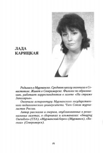 ЛАДА КАРИЦКАЯ Родилась вМурманске. Среднюю школу окончила в Се вастополе. Живет в Североморске. Филолог по образова нию, работает корреспондентом в газете «На страже Заполярья». Окончила аспирантуру Мурманского государствен ного педагогического университета. Член Союза журна листов России. Автор рассказов и очерков, опубликованных в регио нальных газетах, в сборниках и альманахах: «Imaging Ourselves» (USA), «Мурманский берег» (Мурманск), «Ва енга» (Североморск). 86