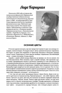 (ІадаИарщкая Окончила в 2002 году историко-фи- лологический факультет Мурманского государственного педагогического института по специальности «Русский язык», в 2008 - аспирантуруМГПУ. Член Союзажурналистов России. Кандидат филологических наук. Работаетжур налистом в газете «На страже Запо лярья». Публиковалась в газетах «Севе роморские вести», «Полярная правда», «Мурманский вестник», «Комсомольская правда», «Норд-Весть-Курьер» и т.п., журналах «Журналист» и «Медиабизнес», альманахах «Ваенга», «Ваенга-2», «Мур манский берег». ОСЕННИЕ ЦВЕТЫ Втесном здании вокзала, где мне предстоит провести два часа между по ездами, немноголюдно. В воздухе висит запах свежеиспеченных пирожков. Как будто ты дома или недалеко от булочной. Вокзалы в больших городах пахнут иначе. Аэропорты в этом смысле вообще стерильные. Беспокоящий запах - словно послание «Съешь меня!». Борьба с самой собой всегда обречена на провал, но это не значит, что она бессмысленна. Моя началась ещё в утробе матери, чей организм сра зу отверг зародившуюся жизнь и всячески стремился от неё избавиться. Ей с отрицательным резусом стоило большого труда забеременеть, а потом вы носить ребенка, которого её организм с первого дня стремился уничтожить. Выход был один: родиться на свет раньше срока, что я и сделала. Так что пер вый конфликт вмоей жизни начался задолго до рождения. Я родилась на два месяца раньше положенного срока, вынеся жизненный урок: пока есть хоть один шанс изменить ситуацию - используй его. С тех пор всё для меня преимущественно чёрно-белое. Даже если ка жется цветным на первый взгляд. Присмотришься - нет, либо чёрное, либо белое. Третьего не дано. Всё как эти полоски на пальто сидящей напротив меня женщины. Чёрная. Белая. Пальто едва достигает колен, из-под него видны ноги в чёрных непрозрачных гольфах. Гольфы врезались в бледное тело под коленями, подчеркивая дряблость последних, а сильно поношен ные туфли - несуразность наряда больше, чем стоящая рядом сумка-те 18