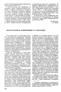 мости. Экономическая политика правительств стран Балтии в 1990-1991 гг.” В заключительный день конференции на заседаниях секции “Западно-восточные отно­ шения”, ее работу возглавляли Б.Л. Хавкин и М. Корнат (Университет кардинала Вышинс­ кого), были заслушаны доклады: Б. Мушала “Последняя надежда? Западная Германия в планах Кремля”; М. Вильке (Институт Людви­ га Больцмана по изучению последствий войн) “Западная Германия и экономический кризис в странах Восточного блока в 1980-е годы”; А. Лебана (эксперт по России Германского бан­ ка, ФРГ) “Германо-советское сотрудничество в строительстве ямальского газопровода”; М. Крамера “Эффективность американского эм­ барго против стран советского блока”; С. Пло- хия “Гуманитарная помощь США Советскому Союзу в 1991 г.”; Э. Кемп-Вельха (Универси­ тет Восточной Англии, Великобритания) “Ве­ ликобритания и экономический кризис стран Восточного блока в 1980-е годы”. В дискуссии по итогам конференции при­ няли участие М. Прозуменщиков, М. Крамер, Б. Мушал, Р. Аренс (Центр современной исто­ рии, Потсдам, ФРГ). О.В. Павленко, Б.Л. Хавкин МЕЖДУНАРОДНАЯ КОНФЕРЕНЦИЯ В СТОКГОЛЬМЕ 24-26 апреля 2013 г. в Стокгольме состоя­ лась международная конференция “Миграция и межкультурное взаимодействие в регионе Балтийского моря”, в которой приняли участие историки из России, Европы, США и Канады. Организаторами конференции со шведской стороны выступили Университет Сёдертёрн (при финансовой поддержке Балтийского фон- да/Ostersjostiftelsen), с российской - Институт всеобщей истории (ИВИ) РАН (при активном содействии международной общественной ас­ социации “Янтарный мост”). Открылось мероприятие в стенах Коро­ левской академии словесности, истории и древностей выступлением ее главного ученого секретаря Э. Нурберга. Было также зачитано приветствие директора ИВИ РАН академика А.О. Чубарьяна, в котором отмечались роль Центра истории Северной Европы и Балтии (руководитель А.А. Комаров) в изучении Скандинавско-Балтийского региона, а также активно развивающиеся академические кон­ такты между российскими, скандинавскими и прибалтийскими историками. А.А. Комаров (ИВИ РАН) выступил перед коллегами с лекцией о научных связях россий­ ских и шведских ученых-историков в период 1970-1990-х годов. На фоне благоприятной внешнеполитической атмосферы начала 1970-х годов стало возможным осуществление ини­ циативы Королевской академии наук регуляр­ но собирать советско-шведские исторические симпозиумы. Среди руководителей первых двусторонних встреч лектор назвал профес­ соров Свена Пальме (двоюродный брат Уло- фа Пальме) и А.С. Кана (в то время ведущего скандинависта АН СССР, ныне проживающего в Швеции). А.А. Комаров заметил, что после распада Советского Союза вместе с государс­ твенным контролем международного сотруд­ ничества ушло и его финансирование. После 1998 г. более чем 30-летняя традиция симпо­ зиумов российских и шведских историков пре­ рвалась. Историческое сообщество искало но­ вые формы взаимодействия. На состоявшейся в Москве летом 2011 г. конференции “Балтий­ ское соседство: Россия, Швеция, страны Бал­ тии на фоне эпох и событий”1 была заложена основа новой традиции встреч историков не только из России и Швеции, но также из стран Балтийского региона. Помимо расширения гео­ графических рамок, особенностью конферен­ ций “нового формат