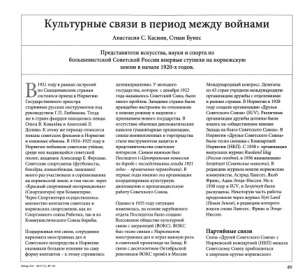 Культурные связи в период между войнами Анастасия С. Касиян, Стиан Бунес Представители искусства, науки и спорта из большевистской Советской России впервые ступили на норвежскую землю в начале 1920-х годов. 1921 году в рамках гастролей по Скандинавским странам состоялся приезд в Норвегию Государственного оркестра старинных русских инструментов под руководством Г.П. Любимова. Тогда же в стране фьордов находились певцы Ольга В. Ковалёва и Анатолий Л. Доливо. К этому же периоду относятся показы советских фильмов в Норвегии и книжные обмены. В 1924-1925 году в Норвегии побывали советские учёные, среди них выдающийся советский геолог, академик Александр Е. Ферсман. Советские спортсмены (футболисты, боксёры, конькобежцы, лыжники) много раз участвовали в соревнованиях на норвежской земле, в том числе, через «Красный спортивный интернационал» (Спортинтерн) при Коминтерне. Через Спортинтерн осуществлялось множество контактов советских и норвежских спортсменов, как из Спортивного союза Рабочих, так и из Коммунистического Союза борьбы. Поддерживая эти связи, сотрудники наркомата иностранных дел и Советского полпредства в Норвегии оказывали большое влияние на саму форму контактов - к этому стремились целенаправленно. У молодого государства, которое с декабря 1922 года называлось Советский Союз, было много проблем. Западные страны были враждебно настроены по отношению к новому режиму и медлили с признанием нового государства. В отсутствие обычных дипломатических каналов гуманитарные организации, союзы военнопленных и торгпредства стали инструментом защиты и представительства советских интересов. Самым важным был Последгол (« Центральная комиссия по борьбе с последствиями голода 1921 года» - примечание переводчика). В первые годы именно эта организация координировала культурную дипломатию и пропагандистскую работу Советского Союза. Однако в 1925 году ситуация изменилась, на основе зарубежного отдела Последгола было создано Всесоюзное общество культурной связи с заграницей (ВОКС). ВОКС был тесно связан с Наркоматом иностранных дел и играл важную роль в советской пропаганде на Запад. В связи с десятилетием Октябрьской революции ВОКС провёл в Москве Международный конгресс. Делегаты из 43 стран учредили международную организацию дружбы с отделениями в разных странах. В Норвегии в 1928 году создали организацию «Друзья Советского Союза» (SUV). Различные организации дружбы должны были влиять на «общественное мнение Запада на благо Советского Союза». В Норвегии «Друзья Советского Союза» были тесно связаны с Компартией Норвегии (НКП). С 1930 г. организация выпускала журнал Russland Idag (Россия сегодня), в 1936 наименовано Sovjetnytt (Советские новости). В редакцию журнала вошли норвежские коммунисты, Астрид Лангсет, Якоб Фриис, Адам Эгеде-Ниссен. Но в 1938 году и SUV, и Sovjetnytt были распущены. Некоторую часть работы продолжили через журнал Nytt Land (Новая Земля), в редакцию которого вошли снова Лангсет, Фриис и Эгеде- Ниссен. Партийные связи Связь «Друзей Советского Союза» с Норвежской компартией (НКП) мешала Советскому Союзу приблизиться к широким кругам норвежского Оттар 314 - 2017 (1): 49-54 49