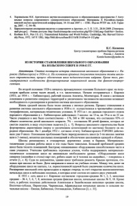 4. Харлампьева Н.К. Арктическое научно-исследовательское и образовательное пространство // Акту­ альные вопросы современного университетского образования: Материалы X Российско-Амери­ канской научно-практической конференции, 14-16 мая 2007 г. - СПб.: Изд-во РГПУ им. А.И. Герце­ на, 2007. - С. 94-98. 5. Циркумполярная декларация инуитов о суверенитете в Арктике, ст. 3. П. 3.33., 28.04.2009. [Электрон­ ный ресурс]. - Режим доступа: http://inuitcircumpolar.com/section.php?ID=25&Lang=En&Nav= Section. 6. Keohane R.O., Nye J.S. (J.). Transnational Relations and World Politics. Cambridge, Ma: Harvard Univer­ sity Press, 1972. 167 P. URL: http://bibl.tikva.ru/base/B1516/B1516Partl4-152.php K.C. Казакова Центр гуманитарных проблем Баренц-региона Россия, г. Апатиты BCsenia-kuznec@yandex.ru ИЗ ИСТОРИИ СТАНОВЛЕНИЯ ШКОЛЬНОГО ОБРАЗОВАНИЯ НА КОЛЬСКОМ СЕВЕРЕ В 1930-Е ГГ. Аннотация. Статья посвящена истории становления школьного образования в г. Ки- ровске (Хибиногорске) в 1930-е гг. На основании архивных документов показаны темпы школь­ ного строительства, процесс обеспечения школ педагогическими кадрами. Кроме того, рас­ сматриваются особенности функционирования национальной школы для финнов-спецпере- селенцев. Во второй половине 1920-х началось промышленное освоение Кольского края: на полу­ остров прибыли сотни тысяч людей, в т.ч. заключенных. Начали отстраиваться г. Кировск (1931; до 1934 г. - Хибиногорск), рабочий поселок Апатиты, Мончегорск. В связи с активным освоением и развитием северных территорий и увеличением численности населения возникает необходимость в расширении и развитии системы школьного образования. Жизнь средней школы была тесно связана с жизнью региона. Процесс становления и развития системы школьного образования в 1930-х гг. осуществлялся в чрезвычайно сложных географических, материально-технических условиях. В 1931-м г. по данным городского отдела народного образования в г. Хибиногорске действовало 3 школы: на 13-м, на 19-м и на 25 км. Число учащихся в них было соответственно - 176, 560 и 180 человек, что составляло 93% от общего количества детей школьного возраста. 7% - составляли 80 детей финнов, которых не смогли охватить в виду отсутствия педагога [1, с. 7]. Вопросы школьного строительства были форсированы директивами сверху и увеличением ассигнований по местному бюджету на на­ родное образование. На 1 декабря 1932 г. согласно отчету Хибиногорского ГОРОНО действо­ вало уже 9 школ. Основными проблемами были перегруженность школ (в 5-ти школах занятия шли в 3 смены), нехватка школьных помещений и обеспечение школьников одеждой и обувью. Школы размещались в стандартных деревянных домах и бараках. Материально- технические условия работы школ в эти годы были тяжелыми. Большой проблемой средних школ была теснота помещений. Быстрому изнашиванию оборудования способствовали часто и сами учащиеся. Учителям требовались огромные усилия, чтобы поддерживать материально- техническое оснащение школ на минимально необходимом уровне. «Оборудование школ скверное (скамейки и столы) парт нет, ребята сидят по 6 человек на скамейке», - говорилось в отчете [1, с. 8]. Судя по документам, здания школ требовали ремонта. Крыши протекали, сто­ ловых при школах не было. Дети завтракали в классе на учебных столах. Между тем, денег на оборудование школ не хватало, т.к. первостепенной задачей было увеличение количества школ. Расширение школьной сети происходило в первую очередь за счет открытия малокомплектных начальных школ в неб