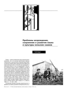 Проблемы возрождения, сохранения и развития языка и культуры кольских саамов Г. М. Керт Саамы— один из уникальных как по своему проис хождению, так и по культуре арктических народов. Генетически и типологически саамский язык наибо лее близок к прибалтийско-финской группе (финский, карельский, вепсский, эстонский и др.) уральской се мьи языков. Вместе с тем, по утверждению Т. Итконе- на в саамском языке до трети словарного состава не имеют соответствий в других уральских языках. При чем лексика отражает жизненно важные для саамов понятия окружающего ландшафта, природных явле ний, флоры и фауны, важнейшие термины человече скойдеятельности, его психические и физические про явления, хозяйственнуюдеятельность ипр., например: emmnj «земля», cadzj «вода», vunntas «песок», keddk «камень», njarrk «мыс», pinnk «ветер», cumnesk «воро ника», cuhhc «глухарь», njuhhc «лебедь», jonng «брус ника», kimmnj «котел», puaz «олень» и т. д. (Itkonen, 1948. Т. I. — S. 165— 167). Субстратная лексика отчетливо свидетельствует о древнем состоянии духовной и материальной культу- Фото на стр. 9 — Г. М. Керт записывает фольклор у местных саамов в д. Иоканге. 1960-е годы