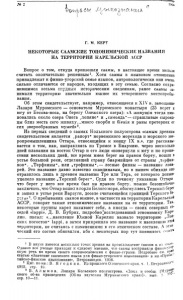 № 2 f? tmf ММ М/Ь+Лль2 и а кua ( <J о Г. M. KEPT НЕКОТОРЫЕ СААМСКИЕ ТОПОНИМИЧЕСКИЕ НАЗВАНИЯ НА ТЕРРИТОРИИ КАРЕЛЬСКОЙ АССР Вопрос о том, откуда произошли саамы, в настоящее время нельзя считать окончательно решенным1. Хотя саамы в языковом отношении принадлежат к финно-угорской семье языков, антропологически они очень сильно отличаются от народов, входящих в эту семью. Согласно сохра нившимся весьма скудным историческим сведениям, ранее саамы за нимали территорию значительно южнее их теперешнего местопребы вания. Об этом свидетельствует, например, относящееся к XIV в. завещание Лазаря Муромского — основателя Муромского монастыря (25 верст к югу от Бесова-носа, на берегу Онежского озера); «А живущія тогда име новались около озера Онега ,лопяне“ и „самоядь”— страшливые сырояд- цы близ места сего живяху...много скорби и біенія и раны претерпех от сих зверообразных мужей»2. Из первых сведений о саамах Кольского полуострова «самым древним свидетельством является грапорт“ норвежского морехода и морского зве ропромышленника Оттара, относящийся к концу IX в.», где рассказы вается о том, как, направляясь из Тромсе в Биармию, через несколько дней плавания на восток Оттар и его люди «повернули к югу и по проше ствии нескольких дней, все время имея берег на правом борту, вошли в устье большой реки, отделявшей страну биармийцев от страны дерфин- нов“ . „Терфинны“ , или „трефинны“ ,— лесные финны — название лопа рей. Это название давно известно скандинавам, но в нашем обиходе оно отразилось лишь в древнем названии Тре или Терь, от которого доныш уцелело название „Терский берег". Судя по точному указанию Оттара что берег у него все время был на правом борту, можно безошибочно заключить, что Оттар вош ел в горло Белого моря, обогнул весь Терский берег и зашел в устье реки Варзуги, доселе считающейся границей Терского бе рега» ". О пребывании саамов южнее, в частности на т е р р и т о р и и Карельской АССР, говорят также этнонпмическне названия на ее территории. Так- некоторые группы карел называют себя, а иногда — своих северных со- седей «Іаррі». Д. В. Бубрих, подробно’исследовавший этнонимику Кар?' лпн. писал: «...население Южной Карелии назвало территорию ^Т°п.' скііх погостов “ Іаррі, а затем прикрепило это название к населению этов территории, не считаясь с изменениями в его этническом составе. А ческий его состав обновился, ибо с некоторых пор тут появилось с"исрѵ 1 В науке имеется несколько точек зрения на происхождение саамов и их Одпако все ученые приходят к единому мнению, что саамы восприняли фшшо-у|(1Г скую речь во время своего соприкосновения с фшшо-ѵграми. Подробнее см. статью «Значение саамского языка для финно-угорского языкознания» в кн «Г)ри“а’ тийско-финское языкознание», Петрозаводск. 1958. 2 Цит. по кн.: В. Я г о д к и н. Из прошлого Олонецкого края. ч. J . Петрозавод'-1, 1918. стр. 10. 3 В . _ А л ы м о в , Лопари Кольского полуострова. «Докл. и сообщ. [МУР^-^ ского об-ва краеведения (Об-ва изучения Мурманского кран)]», вып. ! 1'"" стр. 10—11.