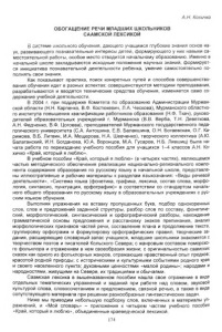 А.Н. Кохичко ОБОГАЩЕНИЕ РЕЧИ МЛАДШИХ ШКОЛЬНИКОВ СААМСКОЙ ЛЕКСИКОЙ Б системе школьного обучения, дающего учащимся глубокие знания основ на­ ук, развивающего познавательные интересы детей, формирующего у них навыки са­ мостоятельной работы, особое место отводится начальному образованию. Именно в начальной школе закладываются исходные положения научных знаний, формирует­ ся инициатива познавательной деятельности ребенка, умение самостоятельно по­ полнять свои знания. Как показывает практика, поиск конкретных путей и способов совершенство­ вания обучения идет в разных аспектах: совершенствуются методики преподавания, разрабатываются и вводятся технические средства обучения, изменяется само со­ держание учебной деятельности. В 2004 г. при поддержке Комитета по образованию Администрации Мурман­ ской области (Н.Н. Карпенко, В.Ф. Костюкевич, Л.А. Ческова), Мурманского областно­ го института повышения квалификации работников образования (Н.Ф. Ткач), руково­ дителей образовательных учреждений г. Мурманска (В.В. Верба, Т.Н. Девяткова, А.Н. Федченко, В.Ф. Цогоева), преподавателей Мурманского государственного педа­ гогического университета (С.А. Антошина, Е.В. Балакшина, О Н. Богаевская, О.Г. Ка­ римова, В.Б. Литвин, И.А. Мещерова, Н.А. Шевченко), творческого коллектива (А.Ю. Балаганский, И.Н. Богданова, Ю.А. Воронцов, М.А. Гусаров, Н.Б. Лившиц) была на­ чата работа по переизданию учебного пособия для учащихся 1—4 классов А.Н. Ко­ хичко «Край, который я люблю». В учебном пособии «Край, который я люблю» (в четырех частях), являющемся частью методического обеспечения реализации национально-регионального компо­ нента содержания образования по русскому языку в начальной школе, представле­ ны иллюстративные и рабочие материалы к разделам языкознания: «Виды речевой деятельности», «Система языка (фонетика, графика, лексика, состав слова, морфо­ логия, синтаксис, пунктуация, орфография)» в соответствии со стандартом началь­ ного общего образования по русскому языку в образовательных учреждениях с рус­ ским языком обучения. Выполняя упражнения на вставку пропущенных букв, подбор однокоренных слов, слов и предложений заданной структуры, разбор слов по составу, фонетиче­ ский, морфологический, синтаксический и орфографический разборы, нахождение грамматической основы предложения и расстановку знаков препинания, анализ морфологических признаков частей речи, составление плана и продолжение текста, группировку орфограмм и формулировку орфографических правил, творческие за­ дания, расширяющие словарный запас учащихся, младшие школьники знакомятся с творчеством поэтов и писателей Кольского Севера; с жанровым составом поморско­ го фольклора и отражением в нем своеобразия жизни; с оригинальностью саамских сказок как одного из фольклорных жанров, отражающих нравственный опыт предков; красотой родной природы; с историческими и культурными событиями родного края и своего населенного пункта; духовными ценностями «малой родины»; народами и народностями, живущими на Севере, их традициями и обычаями. Саамская лексика в вышеназванном пособии нашла свое отражение в виде отдельных тематических упражнений и заданий при работе над словом, звуковой культурой слова, словосочетанием и предложением, связной речью, а также в виде сопутствующего материала при 