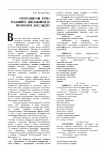 А.Н. КОХИЧКО ОБОГАЩЕНИЕ РЕЧИ МЛАДШИХ ШКОЛЬНИКОВ ВОЕННОЙ ЛЕКСИКОЙ Р ' П системе школьного обучения, дающего W L 0 учащимся глубокие знания основ наук, развивающего познавательные интересы детей, формирующего у них навыки самостоятельной работы, особое место отводится начальному образованию. Именно в начальной школе закладываются исходные положения научных знаний, формируется инициатива познавательной деятельности ребенка, умение самостоятельно пополнять свои знания. В наших условиях курсы русского языка и литературного чтения обогащаются за счет регионального компонента: лексики, отражающей названия местных предметов и явлений, топонимов, художественных произведений местных поэтов и писателей, классиков русской и советской литературы, писавших о Кольском Заполярье. В учебном пособии «Край, который я люблю» (в четырех частях), являющемся частью методического обеспечения реализации национально-регионального компонента содержания образования по русскому языку в начальной школе, младшие школьники знакомятся с народами и народностями, живущими на Севере, их традициями и обычаями, с жанровым составом фольклора; красотой родной природы; с историческими и культурными событиями родного края и своего населенного пункта; духовными ценностями «малой родины». Военная лексика в вышеназванном пособии нашла свое отражение в виде отдельных тематических упражнений и заданий при работе над словом, звуковой культурой слова, словосочетанием и предложением, связной речью, а также в виде сопутствующего материала при решении разнообразных лингвистических задач. Учащиеся начальных классов знакомятся с текстами и готовят сообщения о родственниках и знакомых, участниках Великой Отечественной войны, о сынах полка и юнгах, защитниках Кольского Заполярья, истории учреждения медали "За оборону Советского Заполярья", тружениках тыла, памятниках Защитникам Заполярья, установленных в своих населённых пунктах, стихах и песнях о Великой Отечественной войне в Заполярье и т.п. Ниже мы приводим небольшую подборку слов, включенных в материалы упражнений и «Мой словарь» - приложений к четырем частям учебного пособия «Край, который я люблю», объединенных военной тематикой. В первой части словарной статьи называется заголовочное слово и даётся краткое толкование его современного лексического значения. Вторую часть словарной статьи составляет этимологическая справка, где сообщается источник происхождения слова, выделяется слово или морфема с исторически-опорным написанием, толкуется первоначальное значение слова (оно заключено в кавычки). Завершает статью стихотворение, иллюстрирующее значение слова. Приводимое в словарной статье стихотворение можно использовать для выборочного списывания, выполнения различных орфографических, грамматических и лексических упражнений. АВТОМАТ. Ручное скорострельное стрелковое оружие. Слово образовано от греческих "авто" - "сам" и "матос" - "действовать". Автомат "самодействующий". Нам нужно строить города, Выращивать пшеницу И быть готовыми всегда С любым врагом сразиться. Вот почему наш часовой Всегда стоит на страже. Он охраняет наш покой, И автомат Заряжен. /В. Суслов/ АДМИРАЛ. Воинское звание высшего командного состава военно-морского флота. Слово образовано от арабских "амир" - "повелитель", "владыка" 