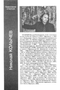 Николай КОЛЫЧЕВ Православная литература КОЛЫЧЕВ Николай Владимирович, поэт, член Союза писателей России. Родился в 1959 в Мурманске. С 1964 жил в Кандалакше. Учился в Ленинградском арктическом училище (1975-77). Работал водителем, старшим кладов щиком-раздатчиком филиала ОРСа Мурманского отделе ния Октябрьской железной дороги, водителем в совхозе «Кандалакшский». С 1986 г. - художественный руководи тель Дома культуры пос. Лувенъга, затем слесарь в совхозе «Кандалакшский». В 1989 г. организовал в дер. Колвица одно из первых в Мурманской обл. фермерских хозяйств. С 1998 г. - в Мурманске. Публикуется в периодической печати с 1982-го. Автор сборников стихов, изданных в Мурманске и Москве. Составитель сборников стихов «Духовная поэзия Севера. Мурманская антология» (изд. Трифонов Печенг- ским монастырем, 2000) и «Север на уровне сердца» (Мур манск, 2004). Автор песни, ставшей гимном г. Кандалакши. Лауреат Всероссийской литературной премии им. А. Про кофьева «Ладога» (2005), «Золотое перо России» (2005, 2006), Большой литературной премии (2009) и др. Соч.: «Цветы и люди » Первая кн. Стихов (Мурманск, 1987); «Учусь грустить и улыбаться» (Мурманск, 1990); «Звонаря зрачок» (Мурманск, 1993); «Звонаря зрачок = KELLONSOITTAJAN SILMATERA» (Мурманск, 1995); «И вновь свиваются снега...» (Москва, 1997); «Зримо» (Мур манск, 1998); «Детские стихи» (Мурманск, 1999); «Поэты выпадают в небо...» (Мурманск, 2000); «Косолапые бо тинки» (Мурманск, 2000); «Ты люби меня, люби меня...» (Мурманск, 2004); «Есть у каждого Русь изначальная » (Мурманск, 2005); «Мур-мурманчанка», сб. детских сти хов (Мурманск, 2007); «Гармония противоречий. Избран ное» (Мурманск, 2007); «Мурманские ступеньки », сб.дет ских стихов (Мурманск, 2008).