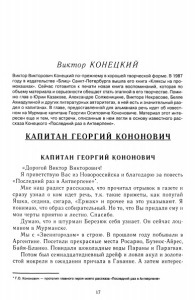 Виктор К О Н Е Ц К И Й Виктор Викторович Конецкий по-прежнему в хорошей творческой форме. В 1987 году в издательстве «Блиц» Санкт-Петербурга вышла его книга «Кляксы на про мокашках». Сейчас готовится к печати новая книга воспоминаний, которая по объему материала и серьезности обещает стать этапной в его творчестве. Поми мо глав о Юрии Казакове, Александре Солженицине, Викторе Некрасове, Белле Ахмадулиной и других литературных авторитетах, в ней есть и значительный раз дел о капитанах. В главе, предоставленной для альманаха речь идет об извест ном на Мурмане капитане Георгии Осиповиче Кононовиче. Материал этот инте ресен еще и тем, что встречи, описанные в нем легли в основу известного рас сказа Конецкого «Последний раз в Антверпене». КАПИТАН ГЕОРГИЙ КОНОНОВИЧ КАПИТАН ГЕОР ГИЙ КОНОНОВИЧ «Дорогой Виктор Викторович! Я приве т с твую Ва с из Но во ро с сий с к а и б л а г о д а рю з а повесть «По сл едний ра з в Антверпене»*. Мне наш ра дис т р а с с к а з а л , что прочит ал о т рывок в г азете и с р а з у у зн а л о ком иде т речь, т.к. т а ки е приме ты, к а к попугай Яшк а , с едина , сиг ар а , « Е р м а к » и прочее на это у к а зыв ают . Я понимаю, что о бра з с о би р а т е л ь ный . Но то, что Вы п р и д а л и ему и мои черты приятно и лестно. Спа си бо . Д ум аю , что и ш т у рм а н Б е р е зю к с ебя узна е т . Он с е йча с л о ц маном в Мурма н с к е . Мы с «Зв ени городом» в с трою. В прошлом году побыв али в Арг ентине . Пос е тили п р е к р а с ны е места Рос арио , Буэнос -Айре с , Б а й я - Б л а н к о . Пов ид а ли шо к о л а дные воды П а р а н ы и П а р а г в а я . Потом был с емн а д ц а т и д н е в ный др ейф и ло в л я а ку л и золоти стой мокрели в ожи д а ни и п р и ч а л а в Га ва нн е . А з а т ем интерес- * Г.О. Кононович — прототип главного героя моего рассказа «Последний раз в Антверпене» 17